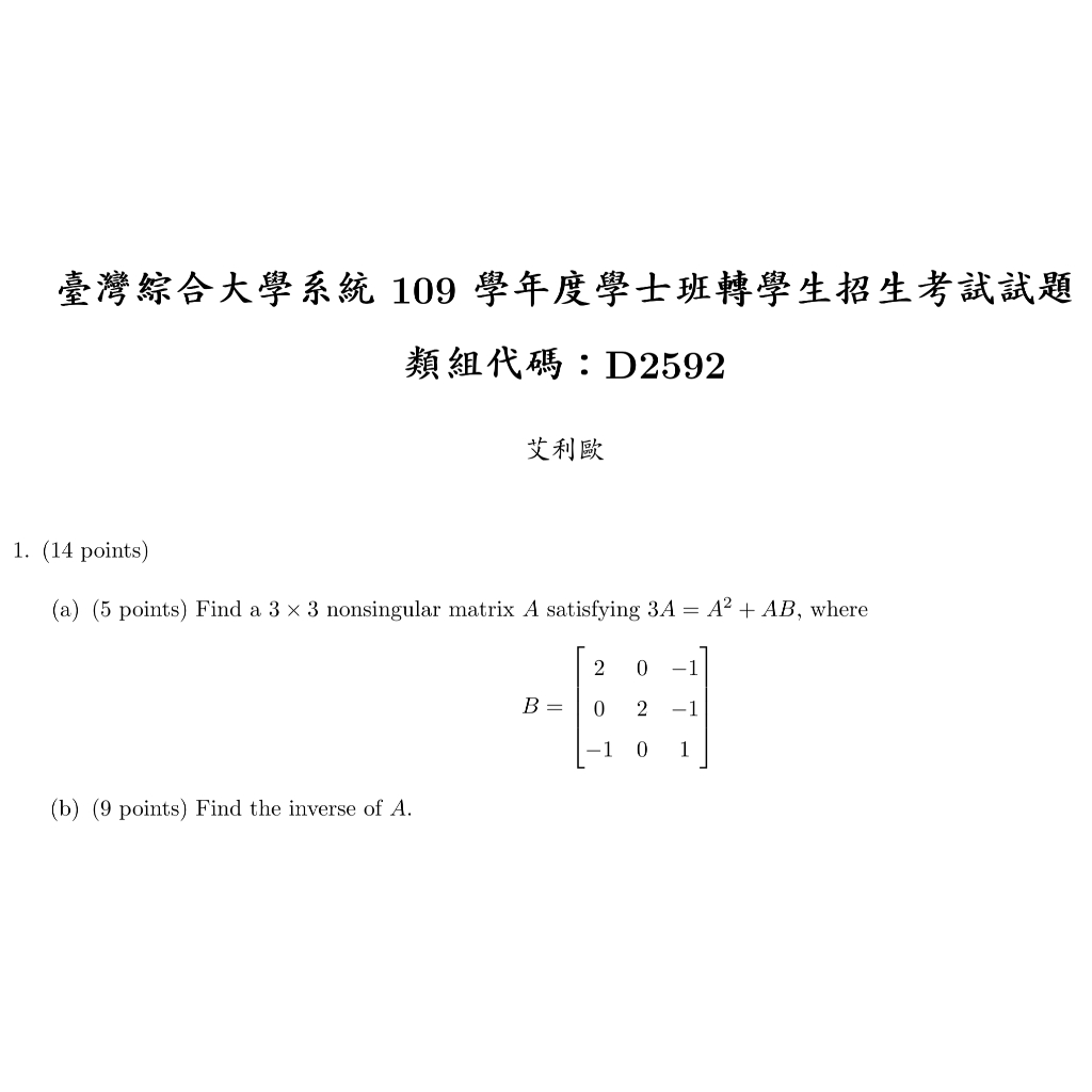 [艾利歐詳解] 台綜大線性代數(類組代碼D2592)轉學考解答