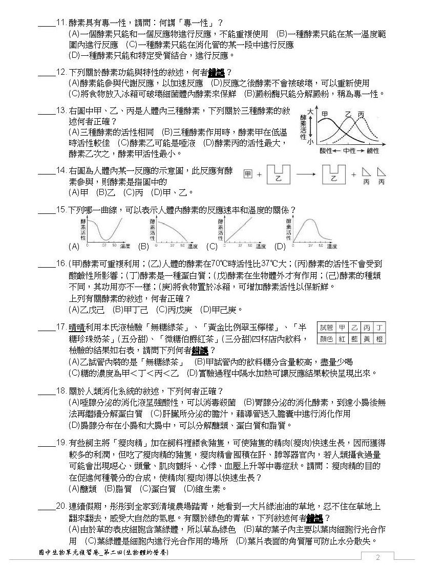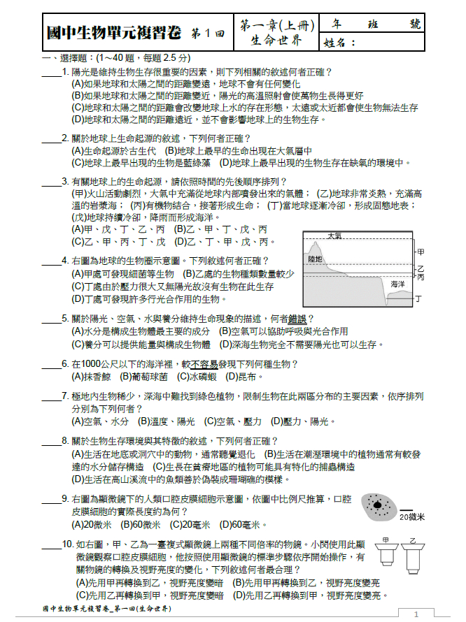 升高中生物單元複習測驗卷_(自然科生物單元_針對升國三暑假,備戰模擬考,考前複習專用)