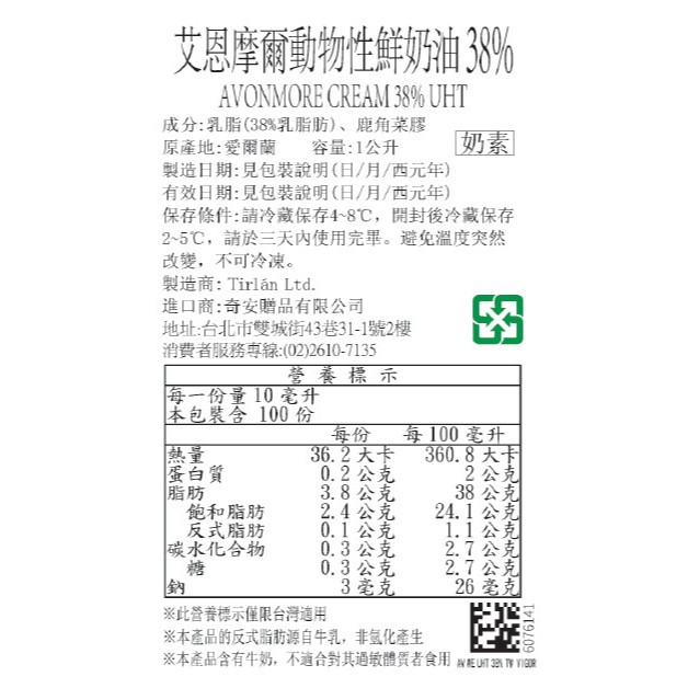 【京原乳酪】Avonmore 艾恩摩爾38% 動物性鮮奶油 (愛爾蘭進口)