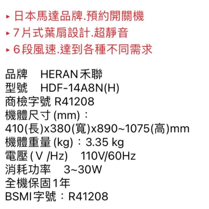 代購免運【HERAN 禾聯】14吋智慧觸控變頻7葉片DC風扇(HDF-14A8NH)