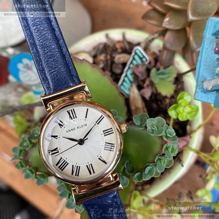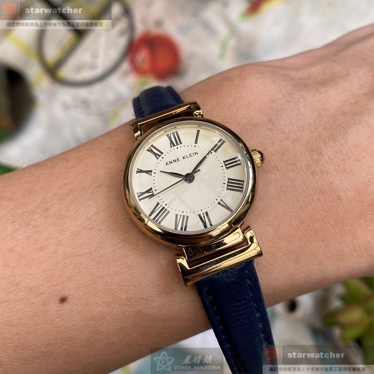 AnneKlein手錶,編號AN00143,26mm金色圓形精鋼錶殼,白色簡約, 羅馬數字錶面,寶藍真皮皮革錶帶款