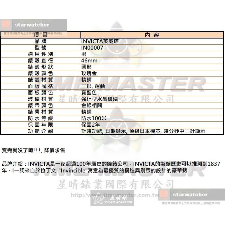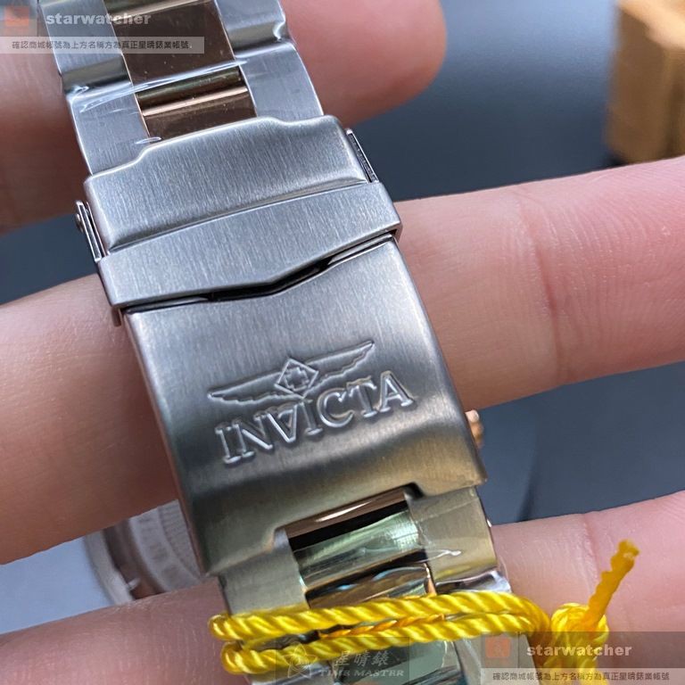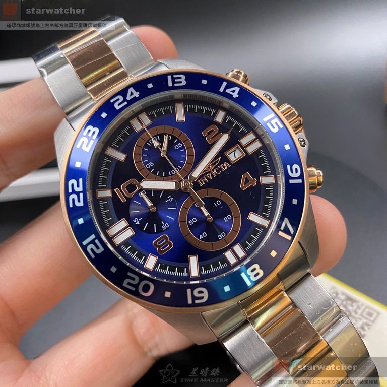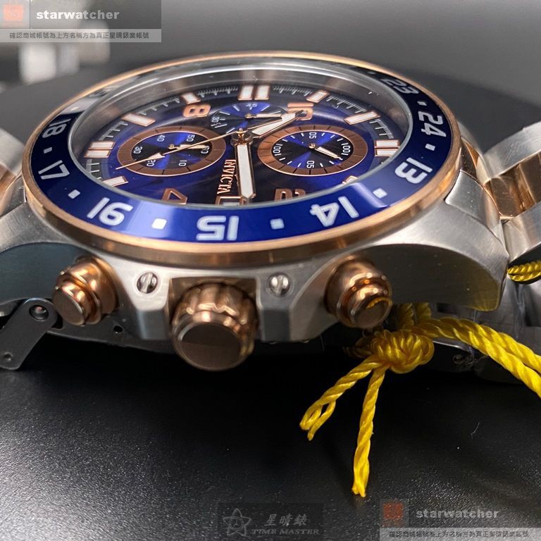 INVICTA手錶,編號IN00007,46mm玫瑰金圓形精鋼錶殼,寶藍色三眼, 運動錶面,金銀相間精鋼錶帶款
