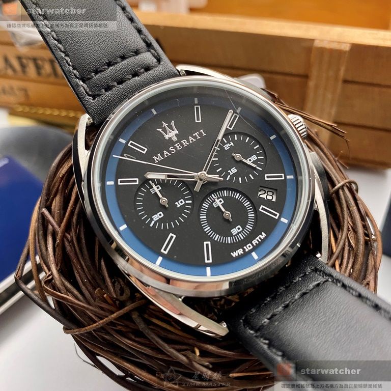 MASERATI手錶,編號R8871632001,42mm銀圓形精鋼錶殼,黑色三眼, 運動錶面,深黑色真皮皮革錶帶款