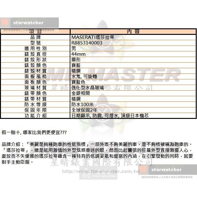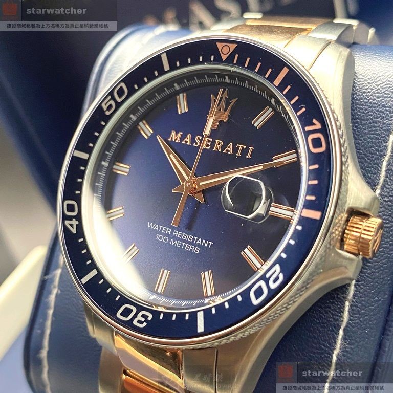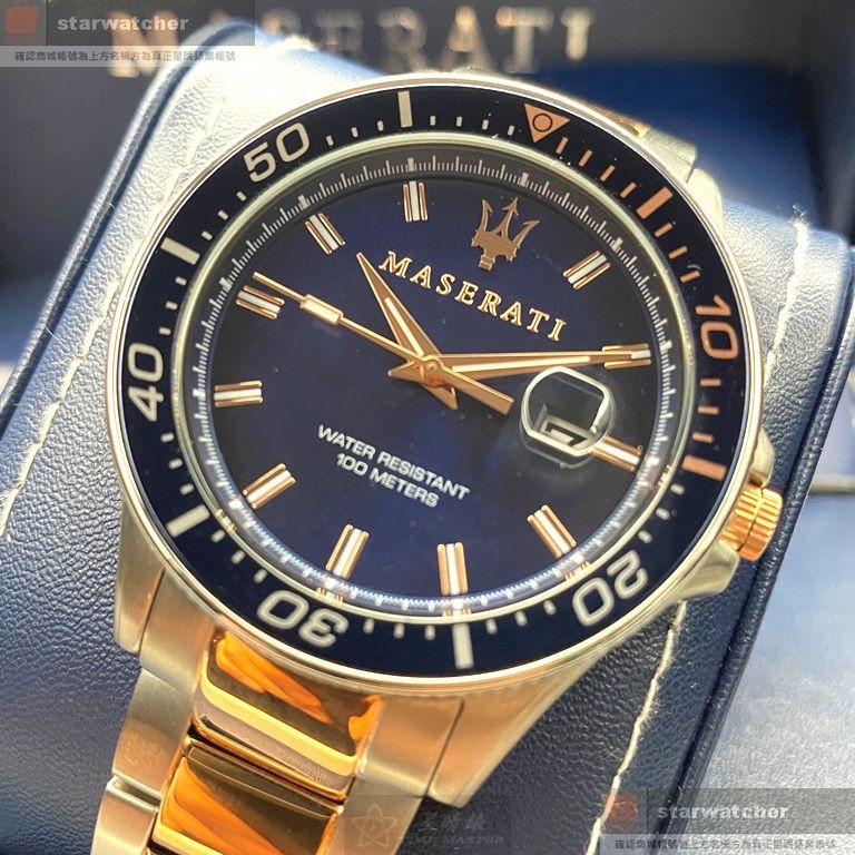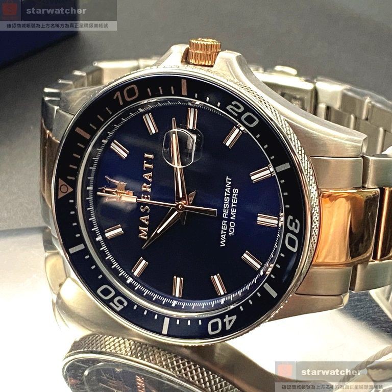 MASERATI瑪莎拉蒂男錶,編號R8853140003,44mm寶藍錶殼,金銀相間錶帶款