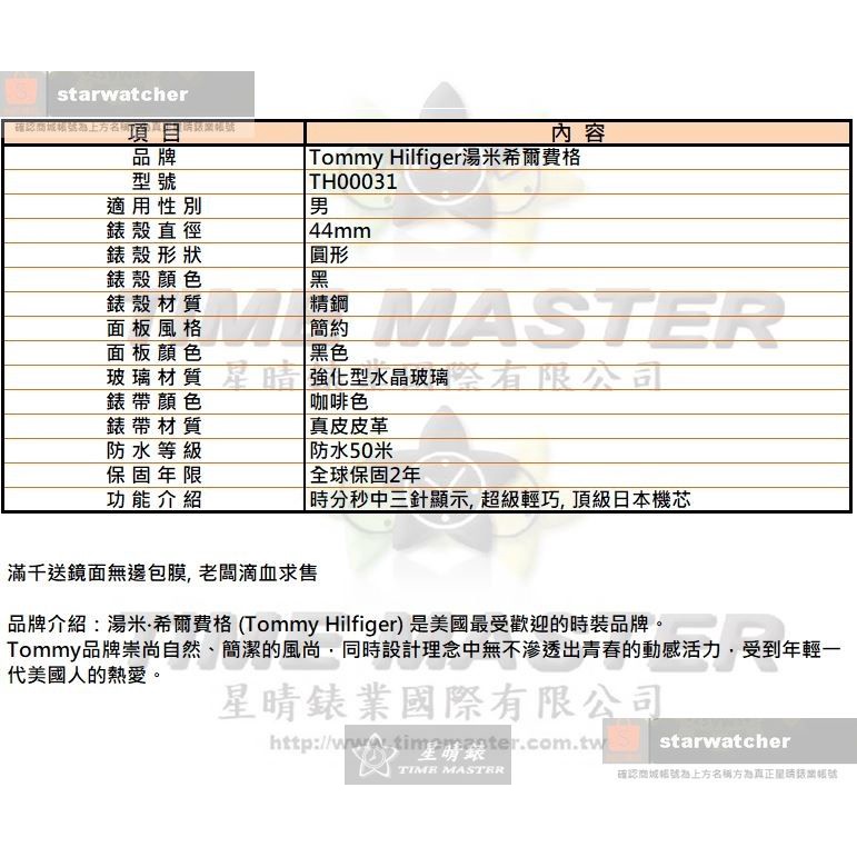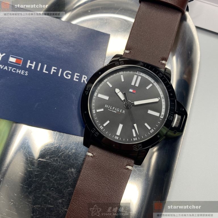 TommyHilfiger手錶,編號TH00031,44mm黑圓形精鋼錶殼,黑色簡約錶面,咖啡色真皮皮革錶帶款