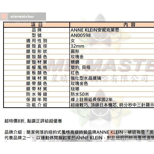 ANNE KLEIN安妮克萊恩女錶,編號AN00598,32mm玫瑰金錶殼,玫瑰金色錶帶款