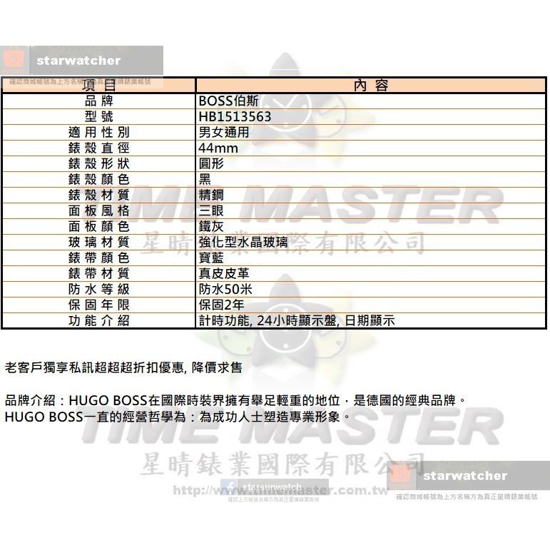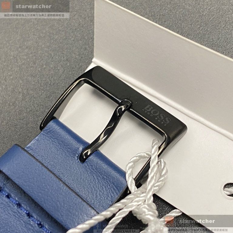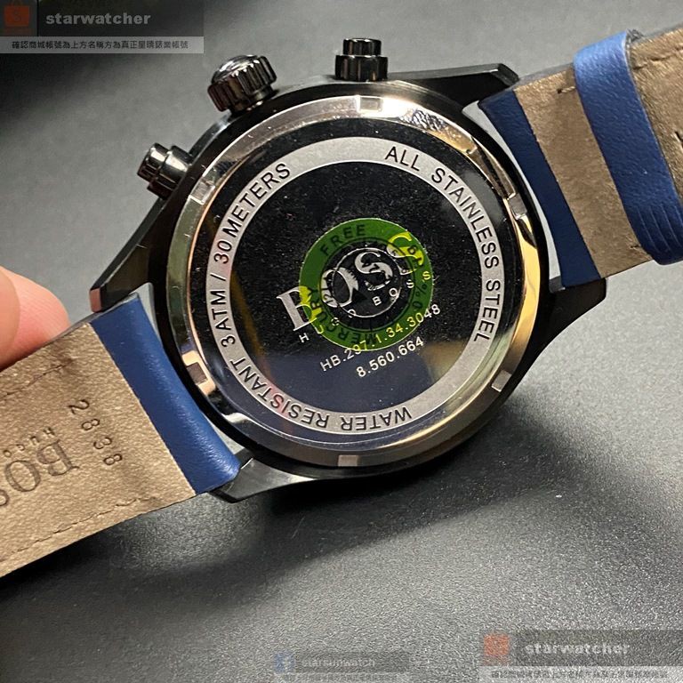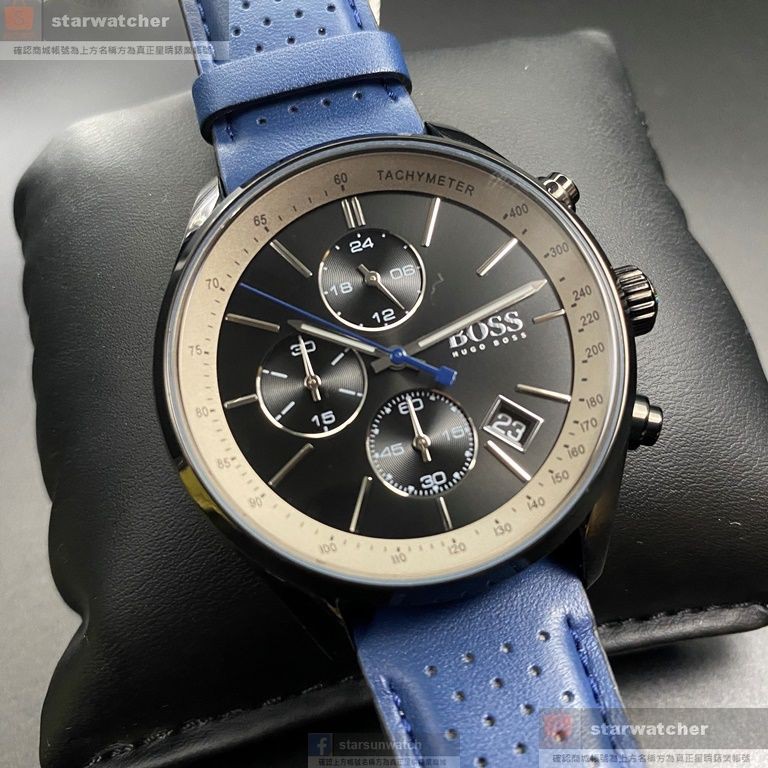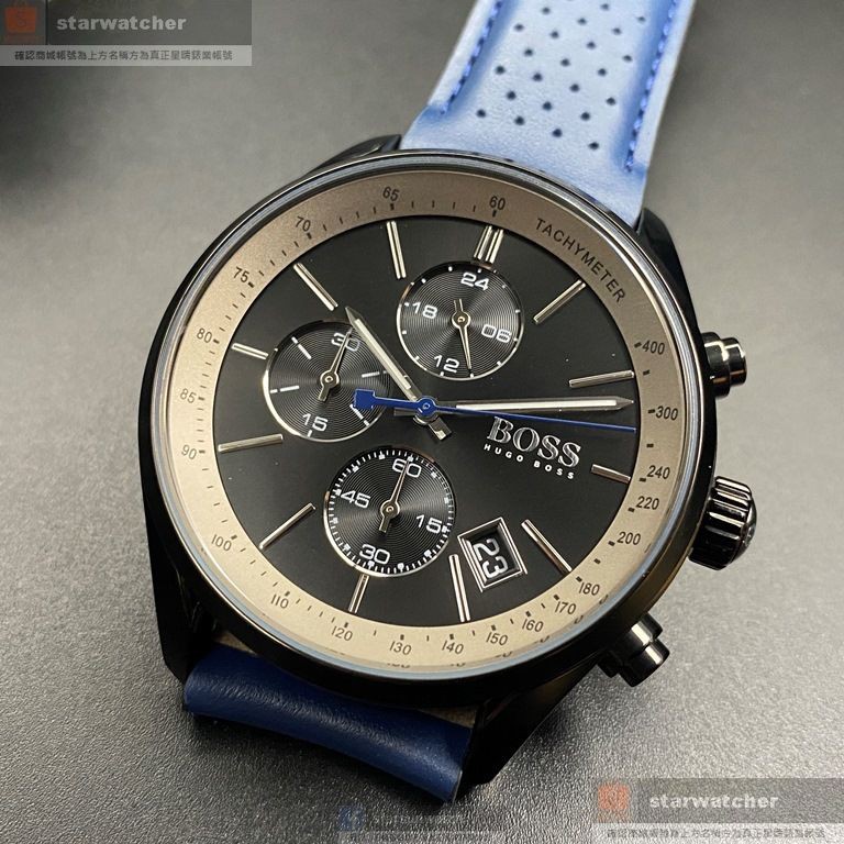 BOSS手錶,編號HB1513563,44mm黑圓形精鋼錶殼,鐵灰三眼錶面,寶藍真皮皮革錶帶款,閃亮度冠絕全場!