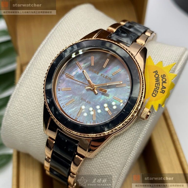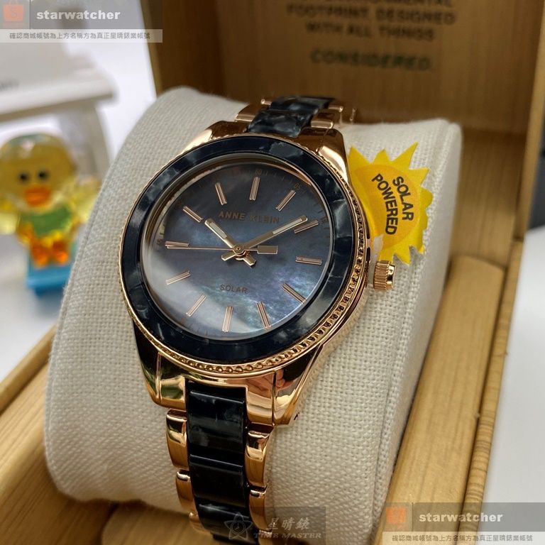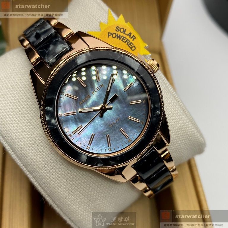 ANNE KLEIN安妮克萊恩女錶,編號AN00619,38mm玫瑰金圓形精鋼錶殼,黑色貝母錶面,黑金色精鋼錶帶款