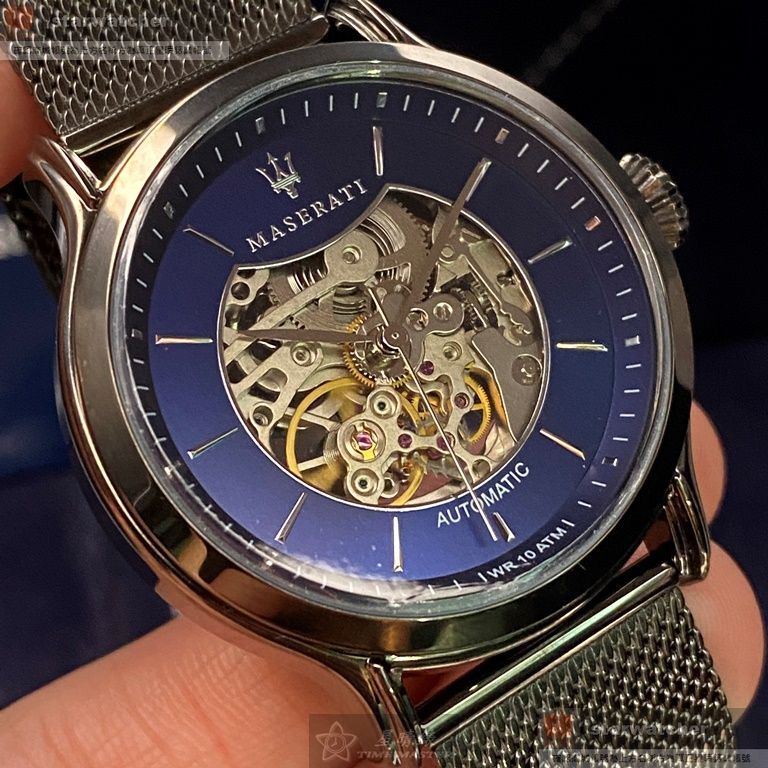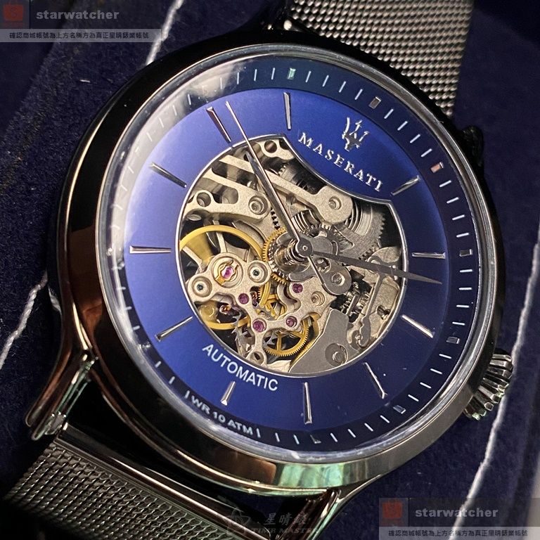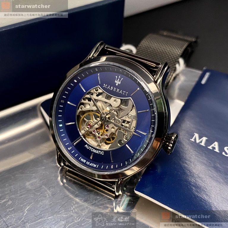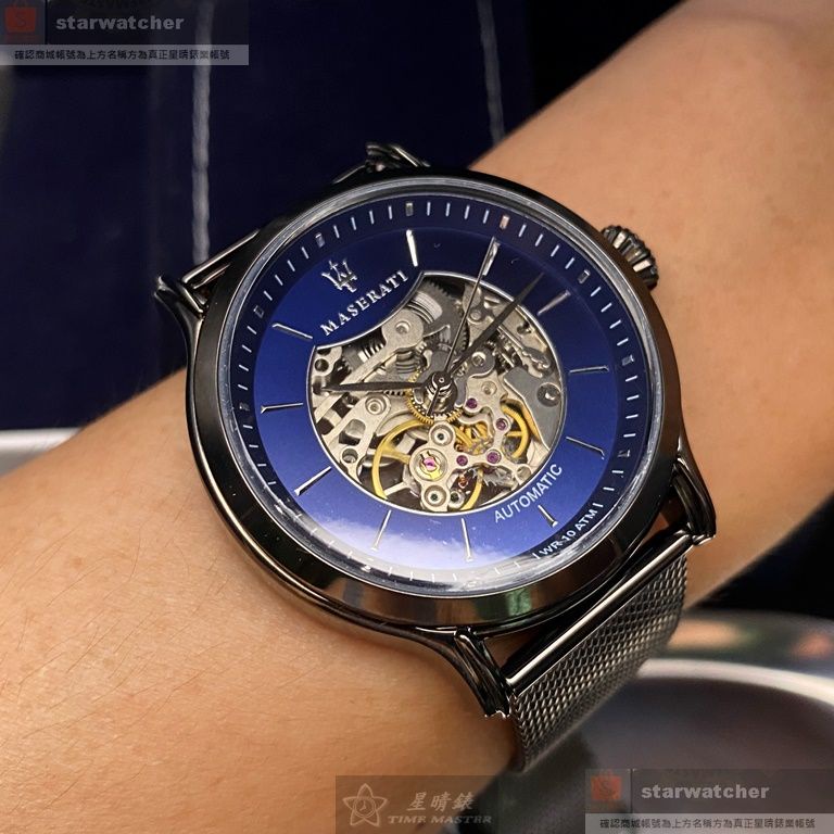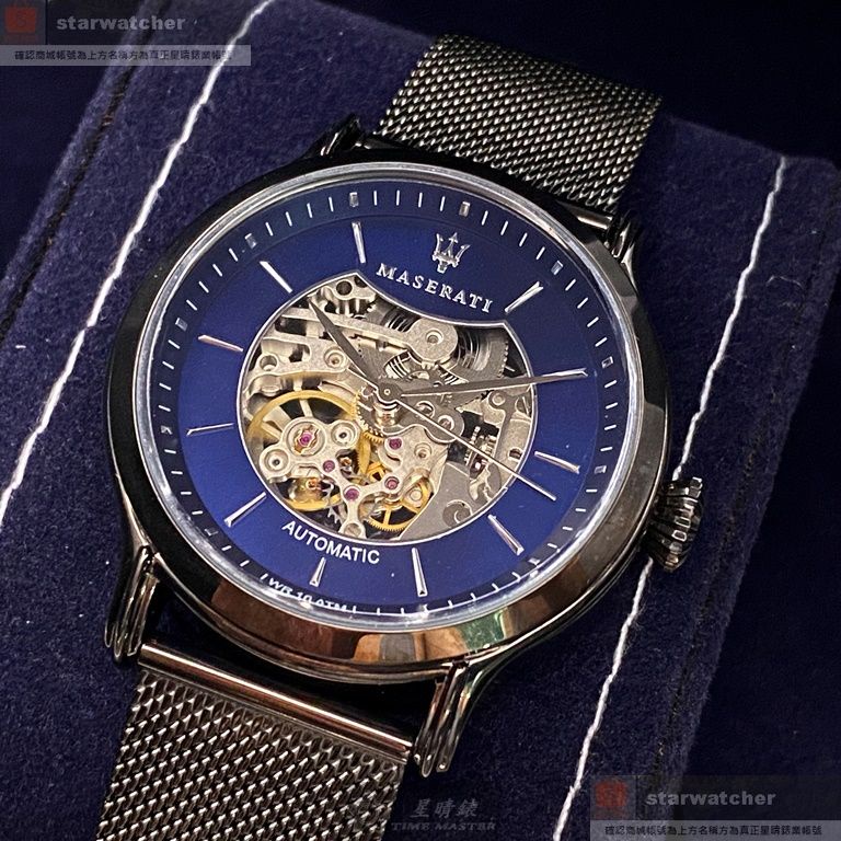 MASERATI手錶,編號R8823118002,42mm槍灰色圓形精鋼錶殼,寶藍色鏤空錶面,黑灰色米蘭錶帶款