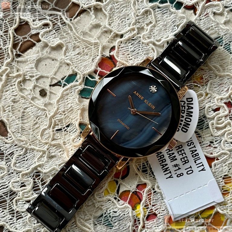 AnneKlein手錶,編號AN00391,30mm黑圓形精鋼錶殼,黑色, 貝母簡約, 貝母錶面,深黑色陶瓷錶帶款