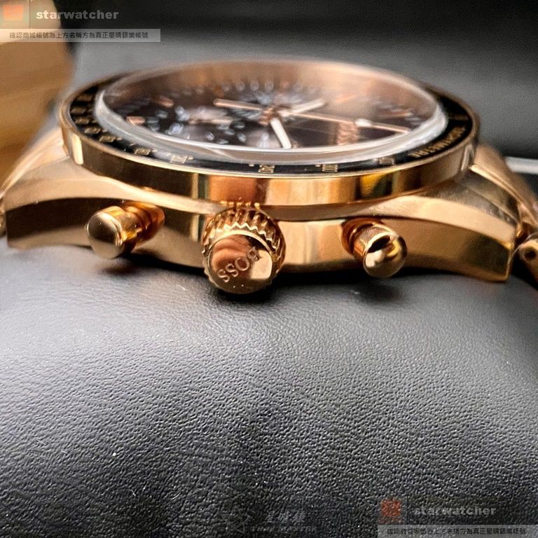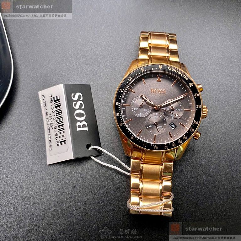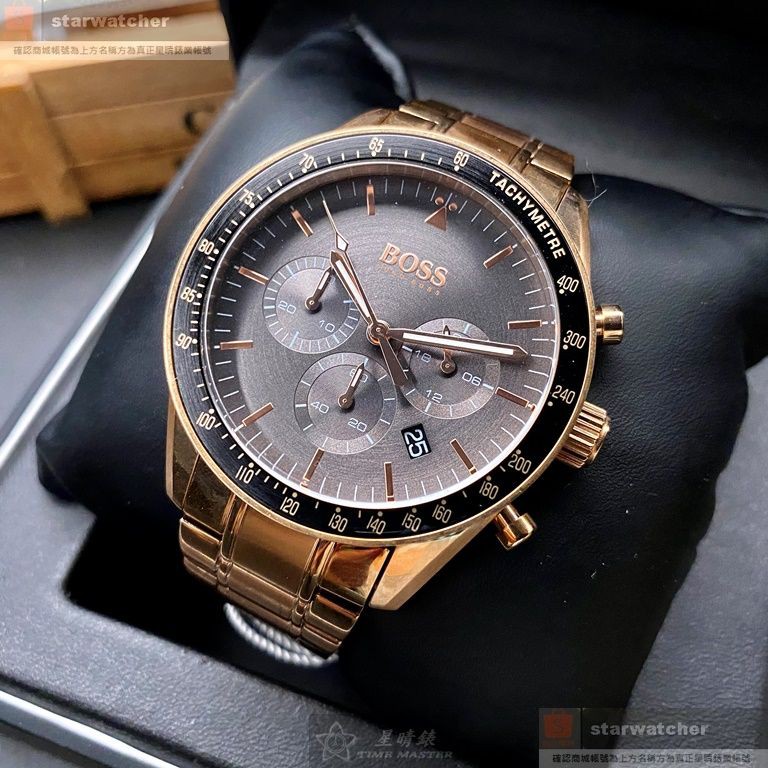 BOSS手錶,編號HB1513632,44mm玫瑰金圓形精鋼錶殼,黑色三眼, 精密刻度錶面,玫瑰金色精鋼錶帶款