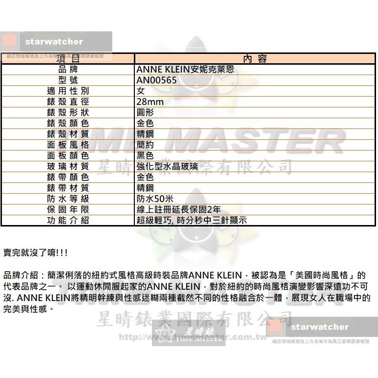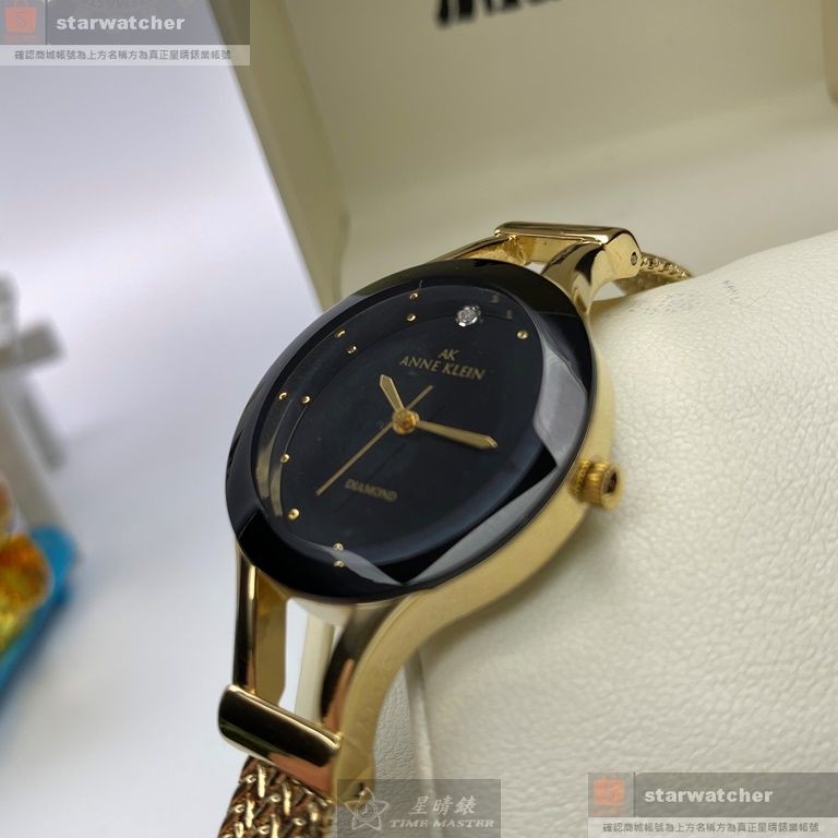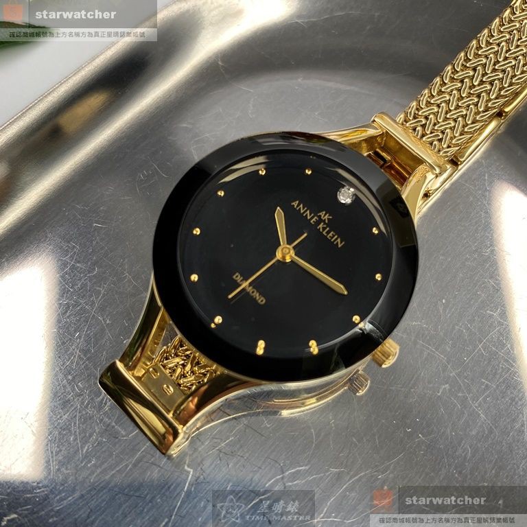 ANNE KLEIN安妮克萊恩女錶,編號AN00565,28mm金色圓形精鋼錶殼,黑色簡約錶面,金色精鋼錶帶款
