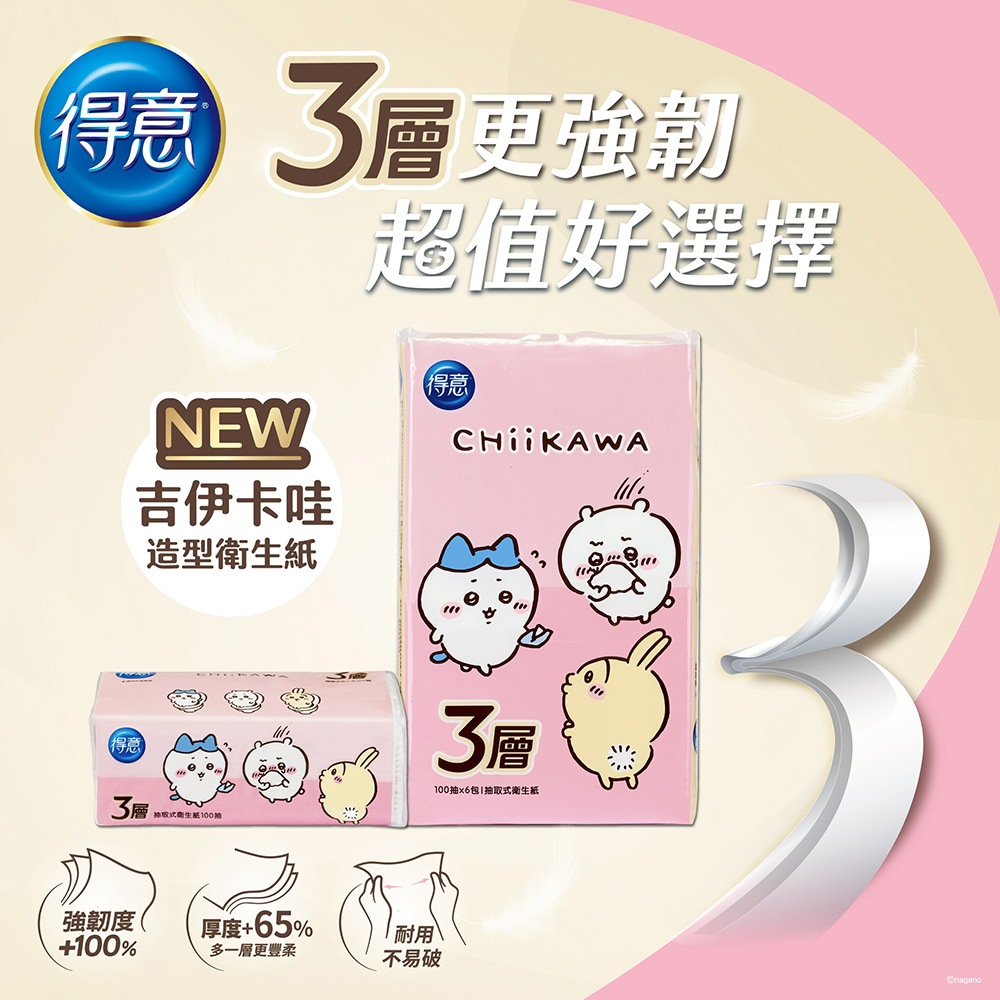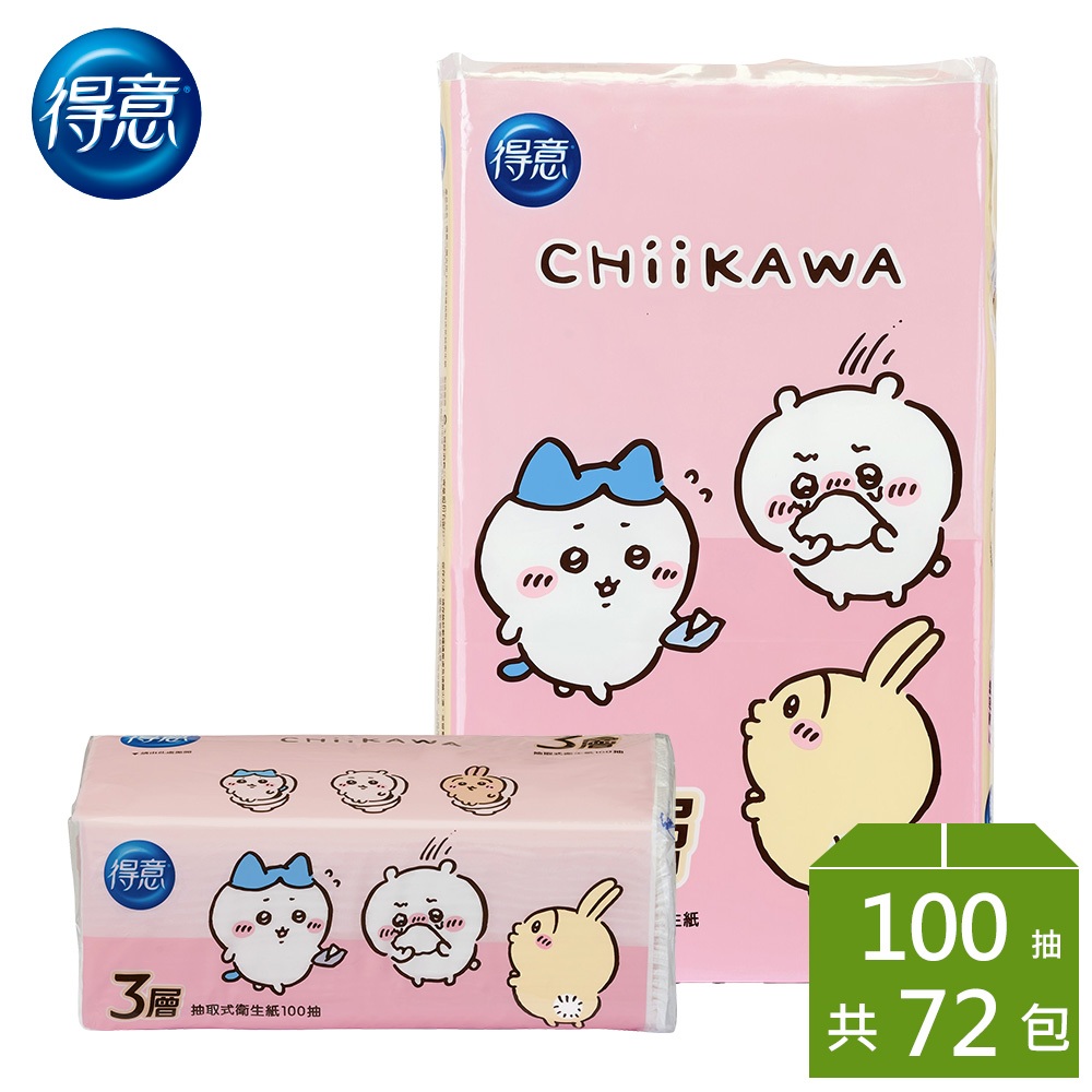 得意 三層抽取式衛生紙100抽x6包x12袋/箱-吉伊卡哇版