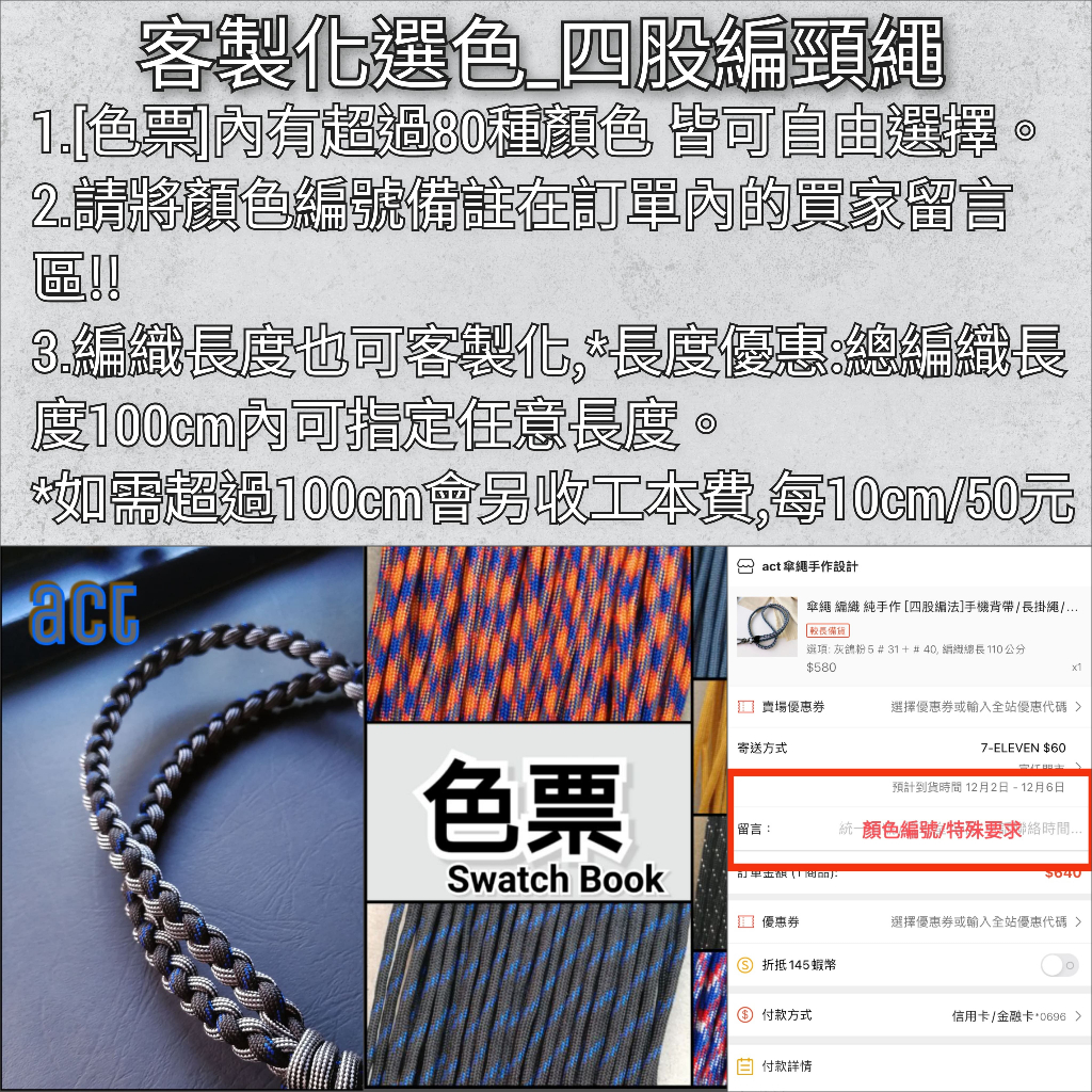 傘繩手編 小眾個性化 手機掛頸繩 [四股編] 識別證掛繩 長度可客製化 多色 act傘繩 自選配色客製化禮物