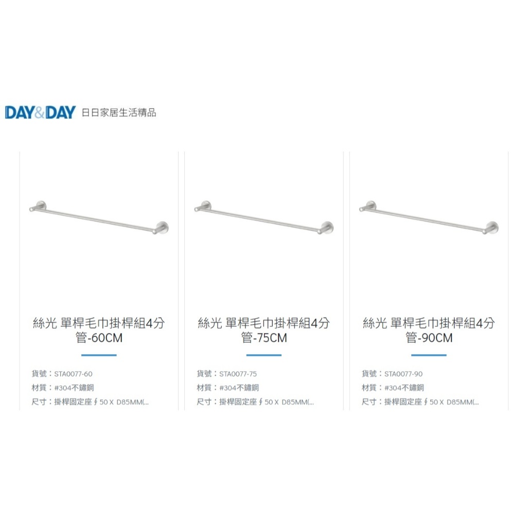 愛琴海廚房 DAY&DAY STA0077-60/75/90公分 毛巾桿 掛衣桿 橫桿 掛桿304不鏽鋼絲光