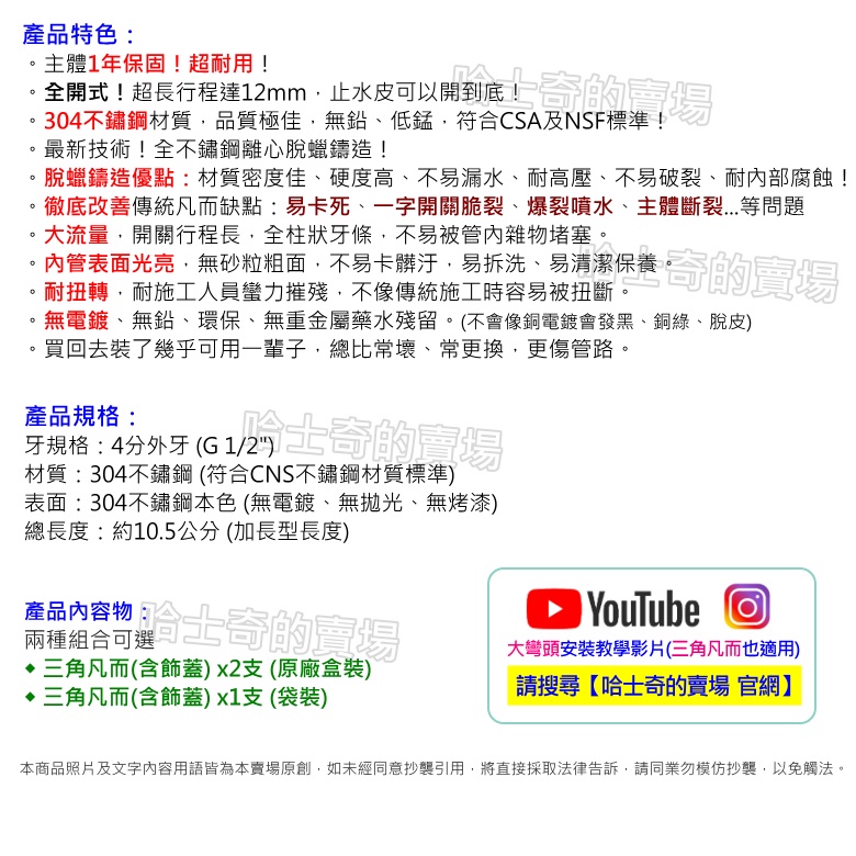 【全開式】304不鏽鋼 加長 一字外牙 三角凡而 一字凡而 三角外牙 一字開關 外牙開關 外牙 角閥 角栓 無鉛 不銹鋼