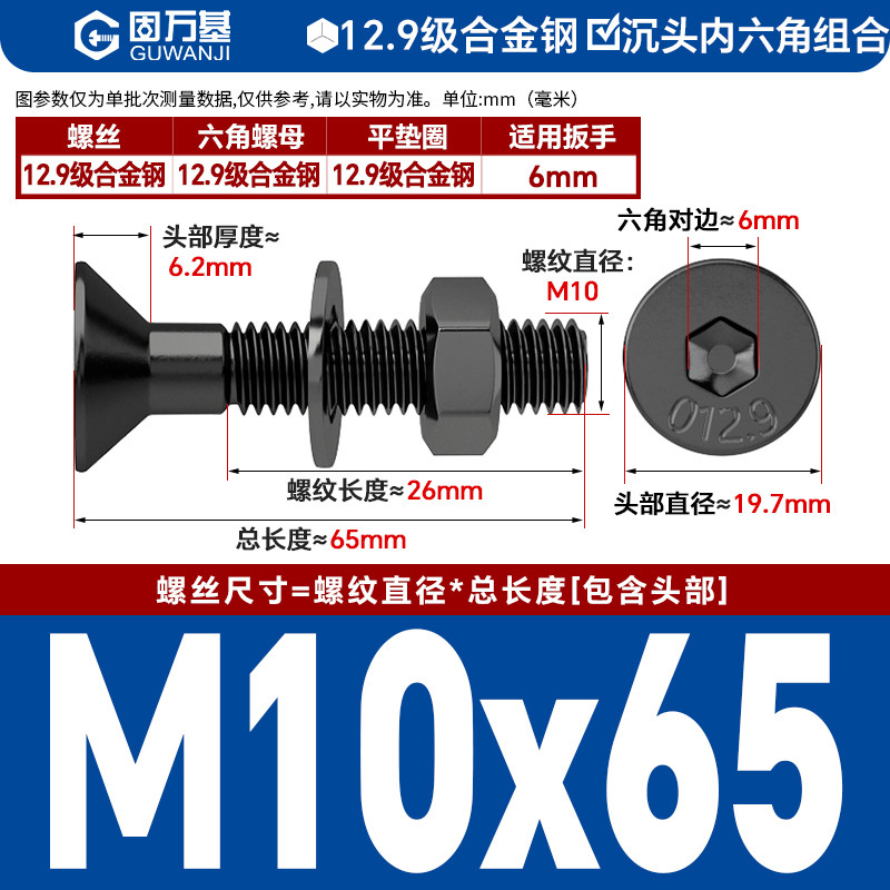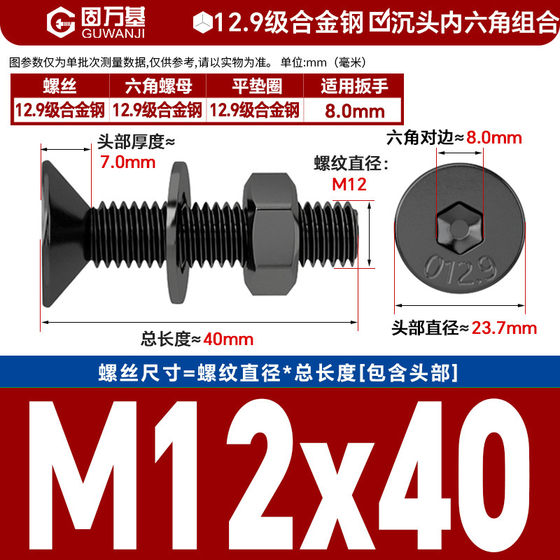 固万基12.9级高强度沉头内六角螺丝套装平头螺栓带螺母垫片组合