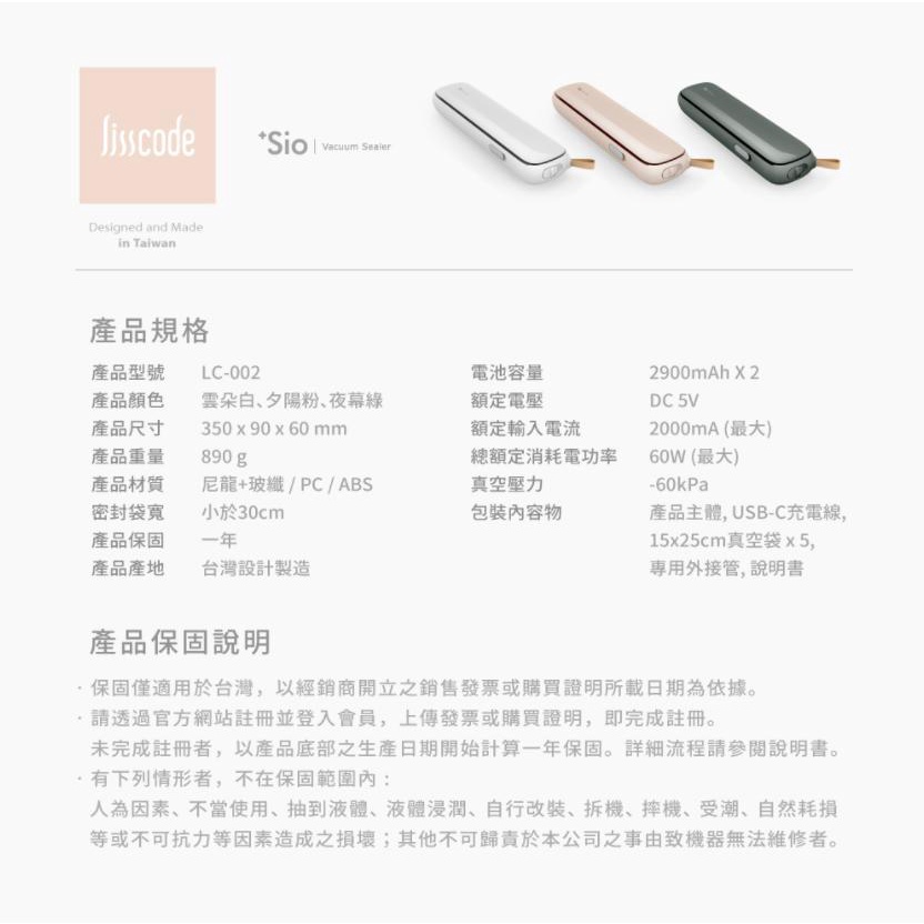 Lisscode 鮮食小封 無線真空封口保鮮機 雲朵白 台灣製造