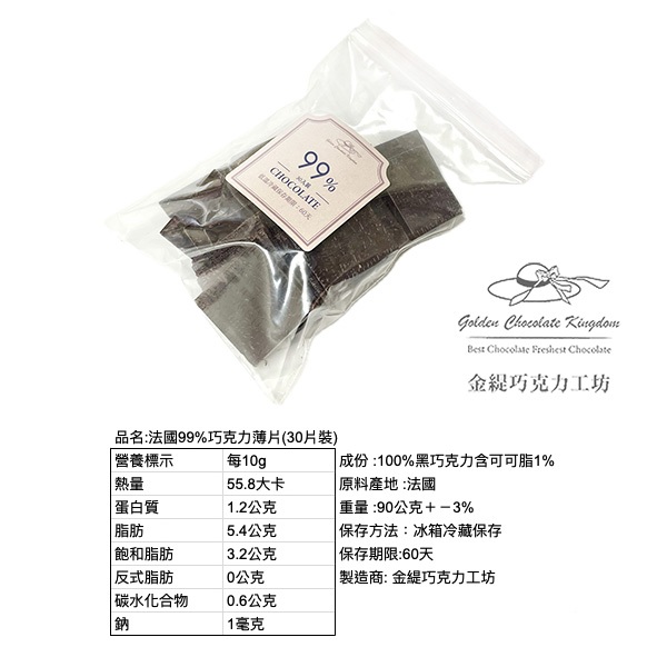 99% 純黑巧克力薄片 純可可脂 巧克力片 無醣 法國進口 環保簡易包裝
