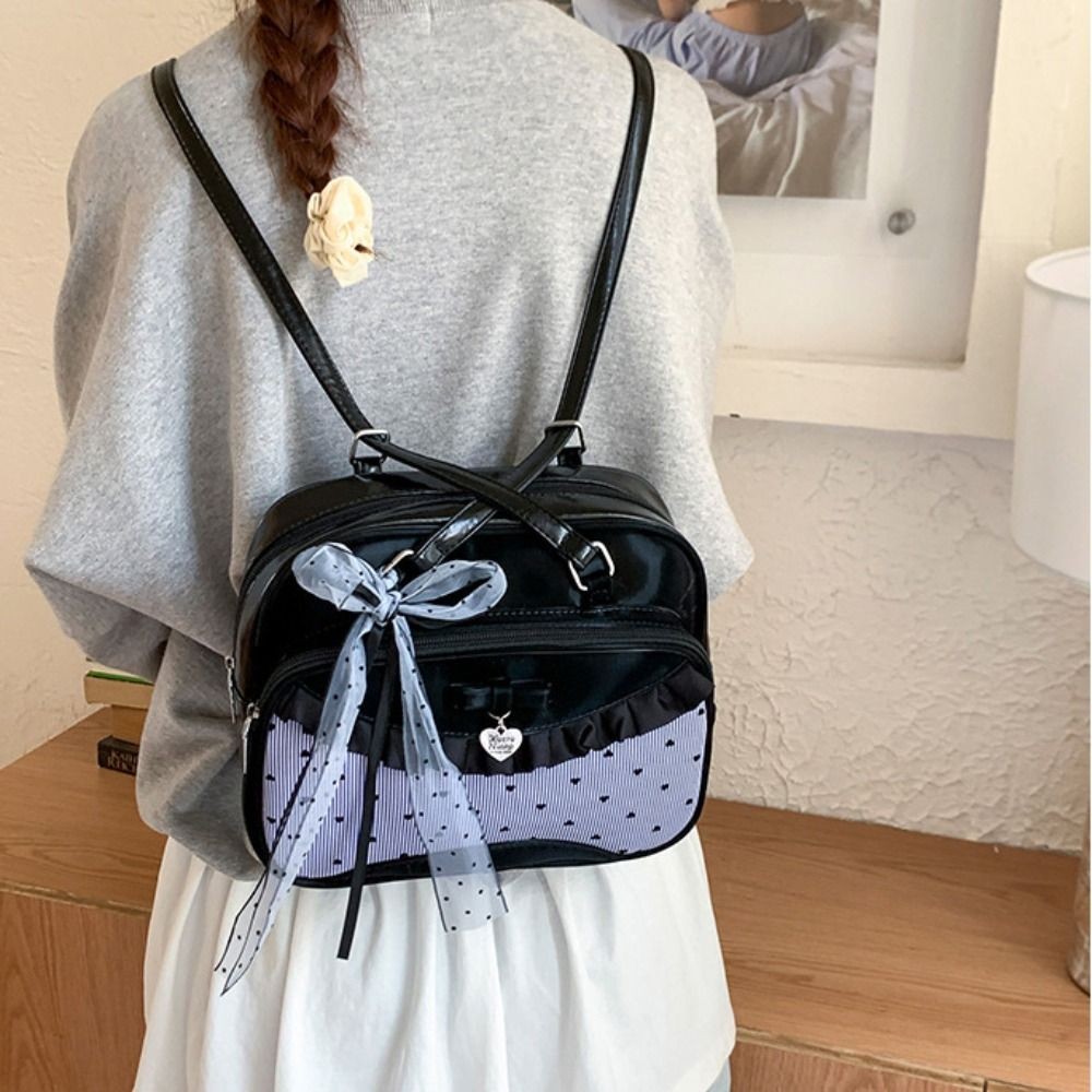 LAMIABO 蝴蝶結絲帶保齡球包,大容量韓式波士頓單肩包,時尚優雅蕾絲絲帶 PU 皮革女式手提包學校