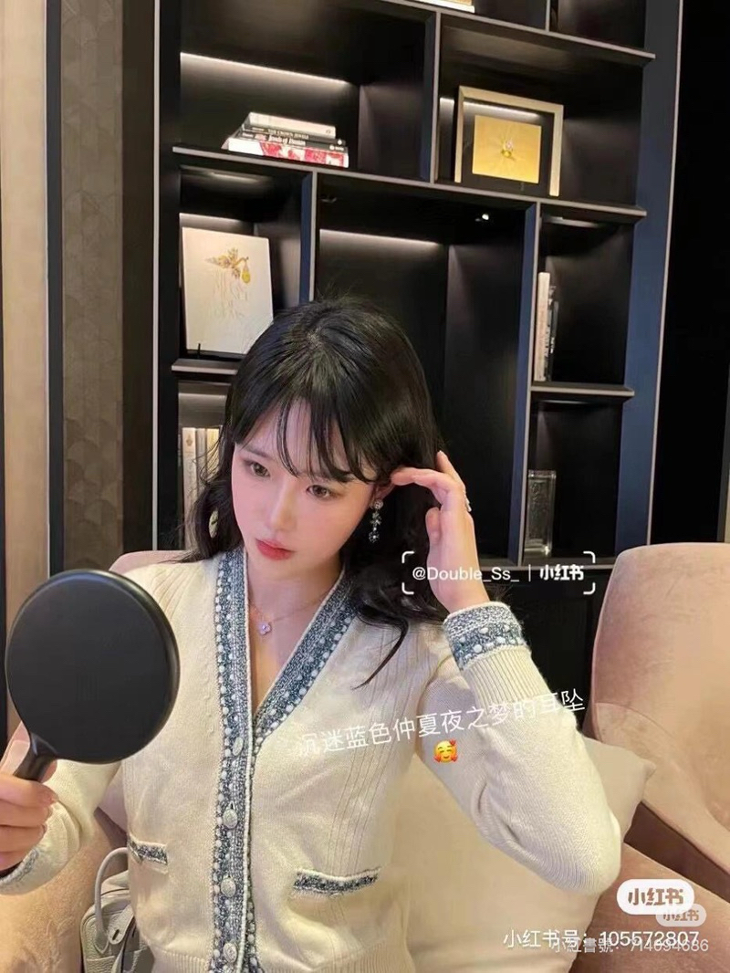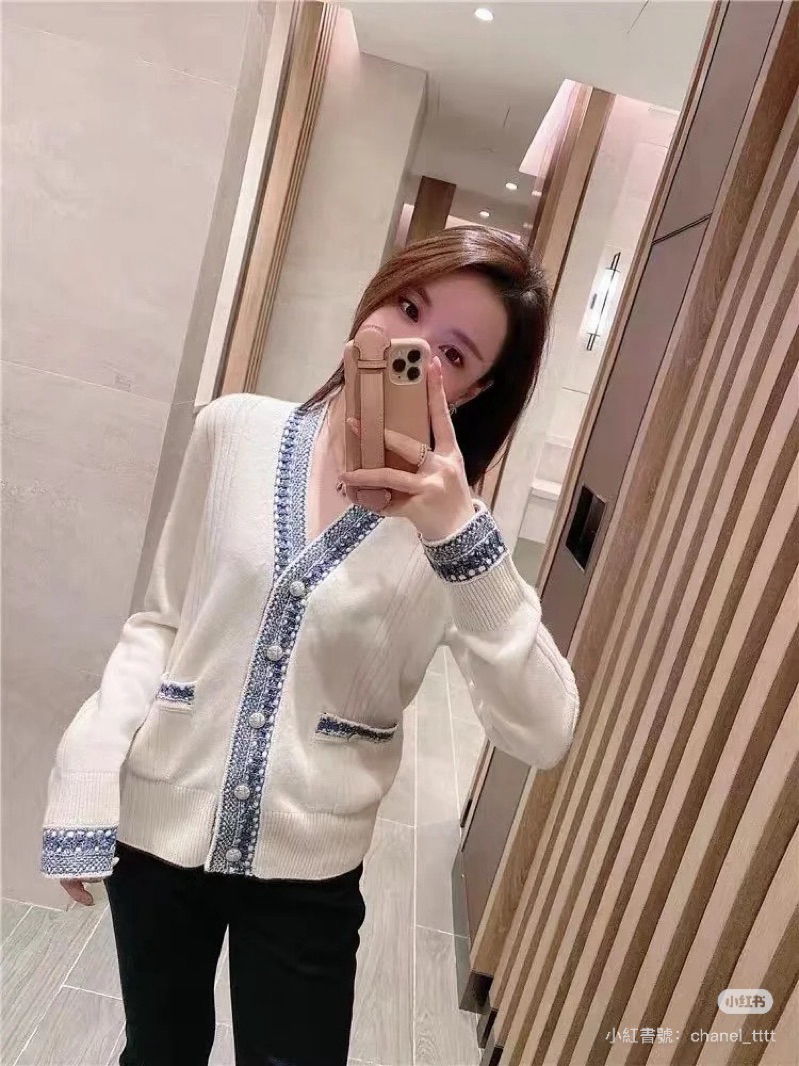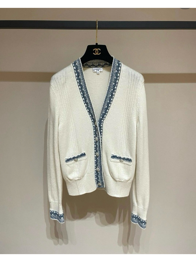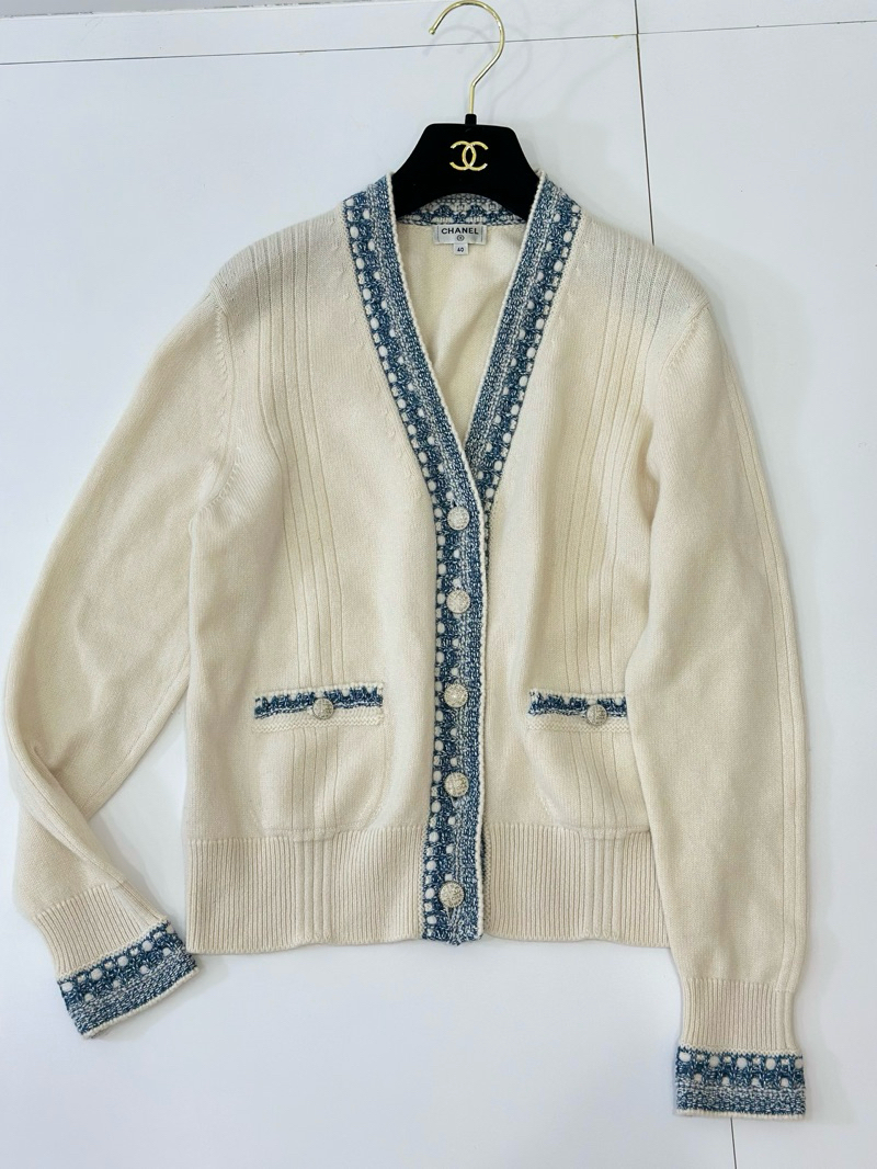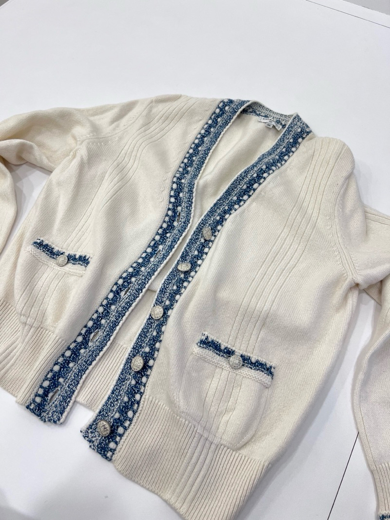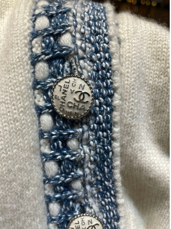 Chanel 香奈兒 白色 羊絨 藍編織 花邊拼色 口袋 針織外套 毛衣外套 外套 針織上衣 羊絨開襟衫