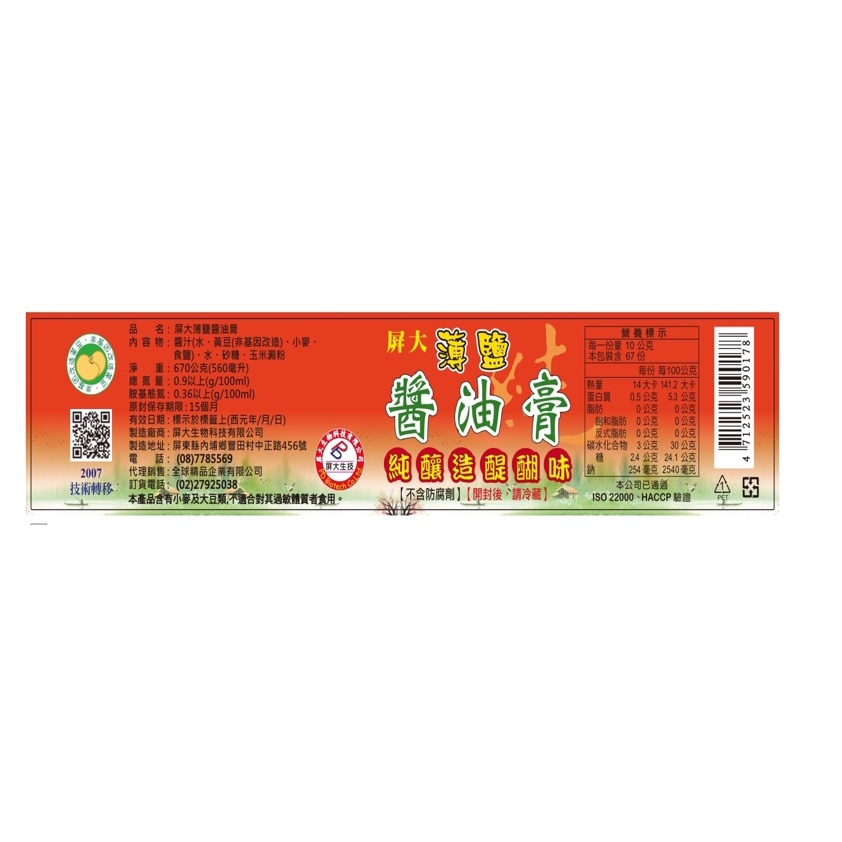 屏大薄鹽醬油膏560ml