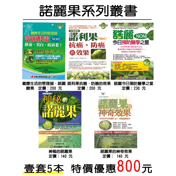 諾麗果系列叢書」壹套5本(缺書1本諾利果抗癌防癌的效果缺書)。特價 $800 元,壹套共4本,特價640元
