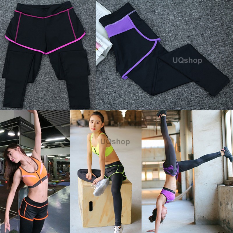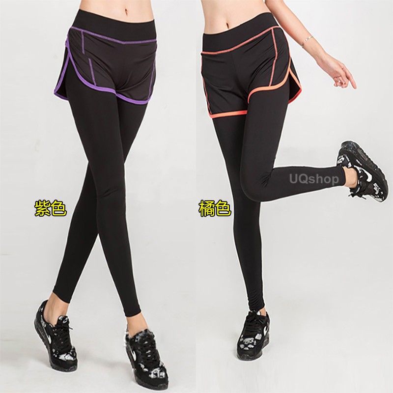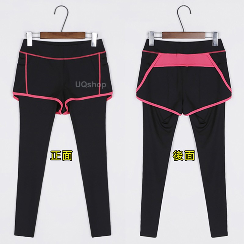 現貨 韓版女 假兩件式 運動褲 瑜珈褲 運動緊身長褲 緊身褲壓力褲跑步褲 瑜伽健身褲 瑜珈韻律褲 顯瘦 九分褲 運動褲裙