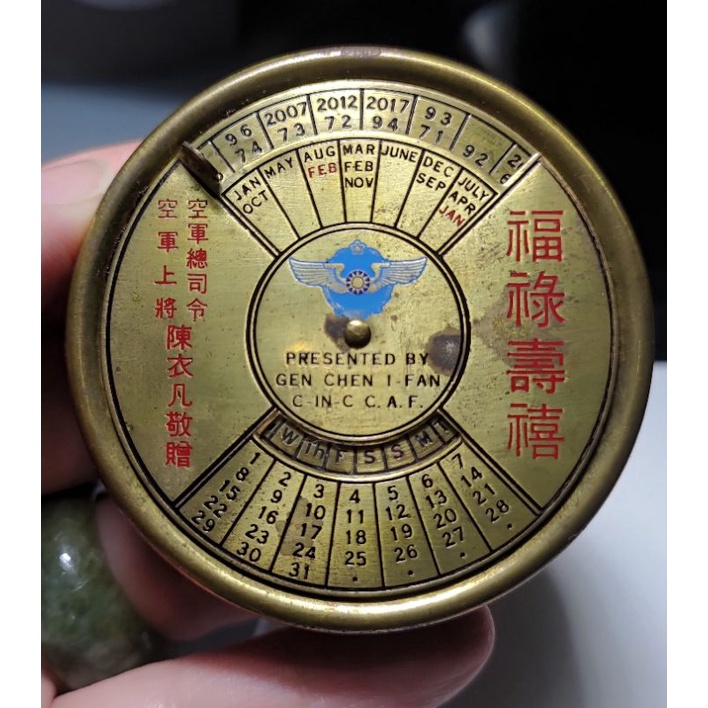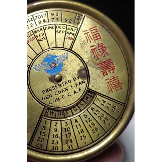 早期 第六任 前 空軍總司令 陳衣凡將軍 贈 銅質 福祿壽喜 紀念擺件/紙鎮/日曆
