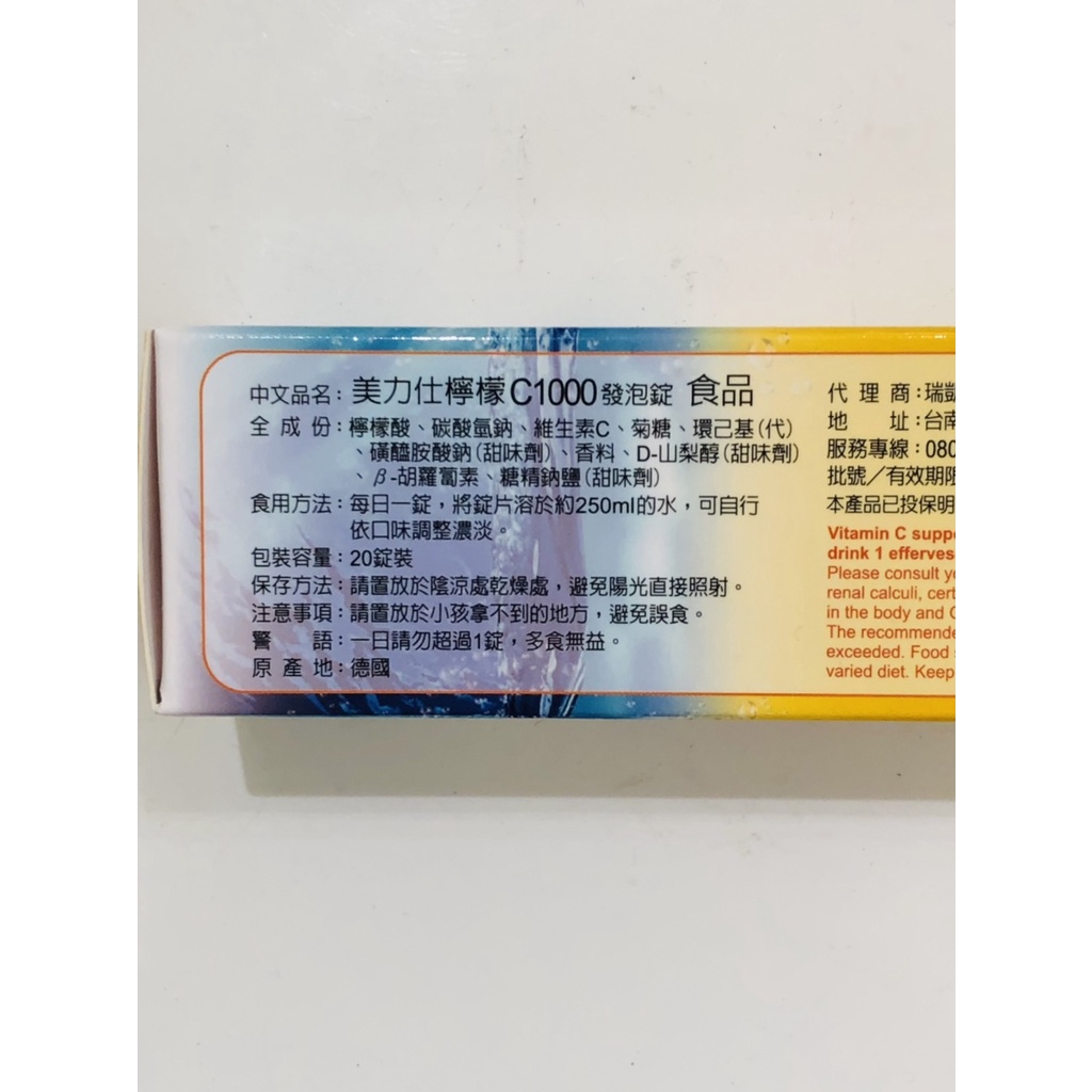藥局出貨 德國 美力仕 維他命C1000發泡錠-檸檬口味 20錠/盒 (2003289)