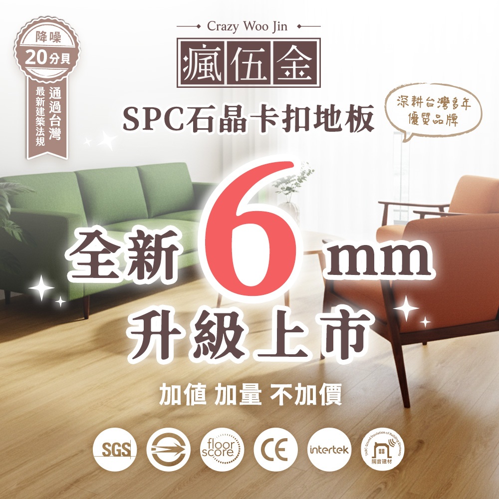 瘋伍金【隔音降噪認證】SPC卡扣 6mm 木紋地板 拼接 防水 免膠 現貨 無甲醛 租屋 DIY 石塑 改造 裝潢