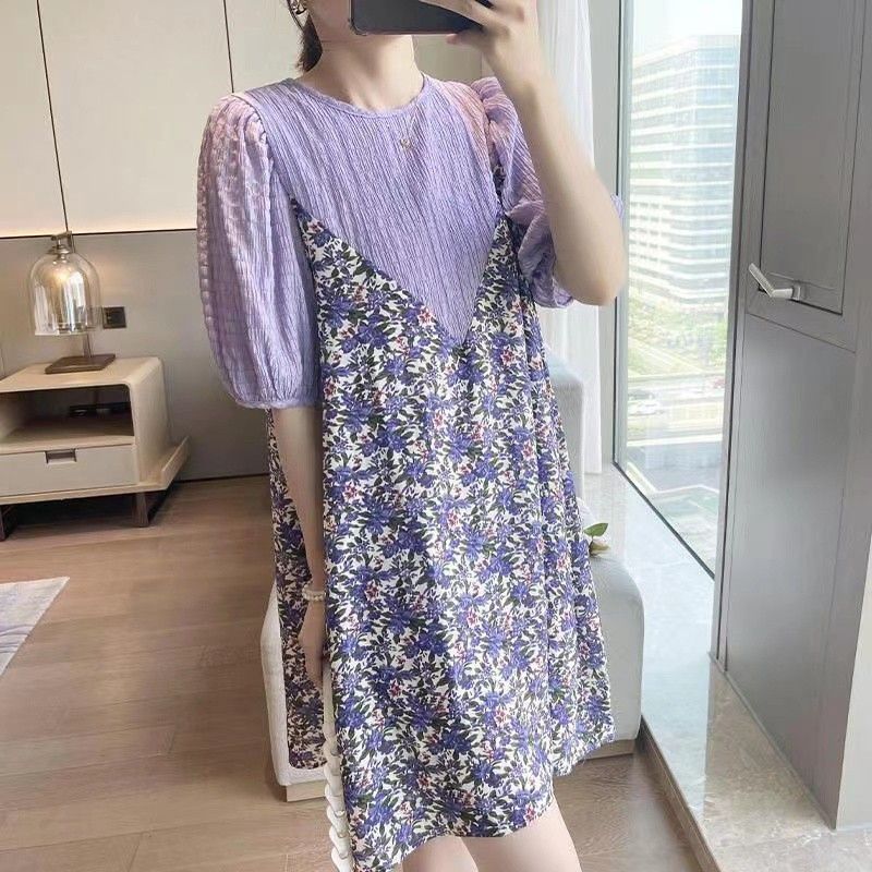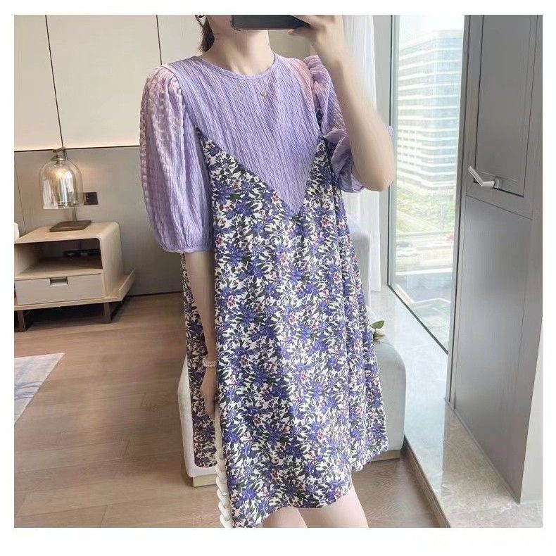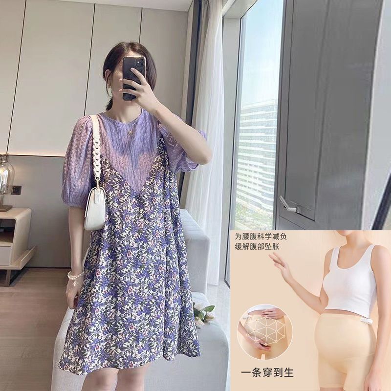 🔥蝦皮最低價🔥孕婦夏裝連衣裙外出中長款寬鬆大碼減齡碎花孕期雪紡拼接假兩件潮