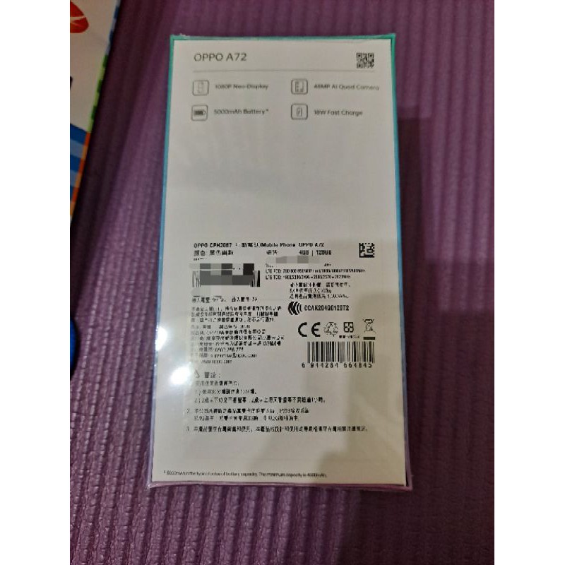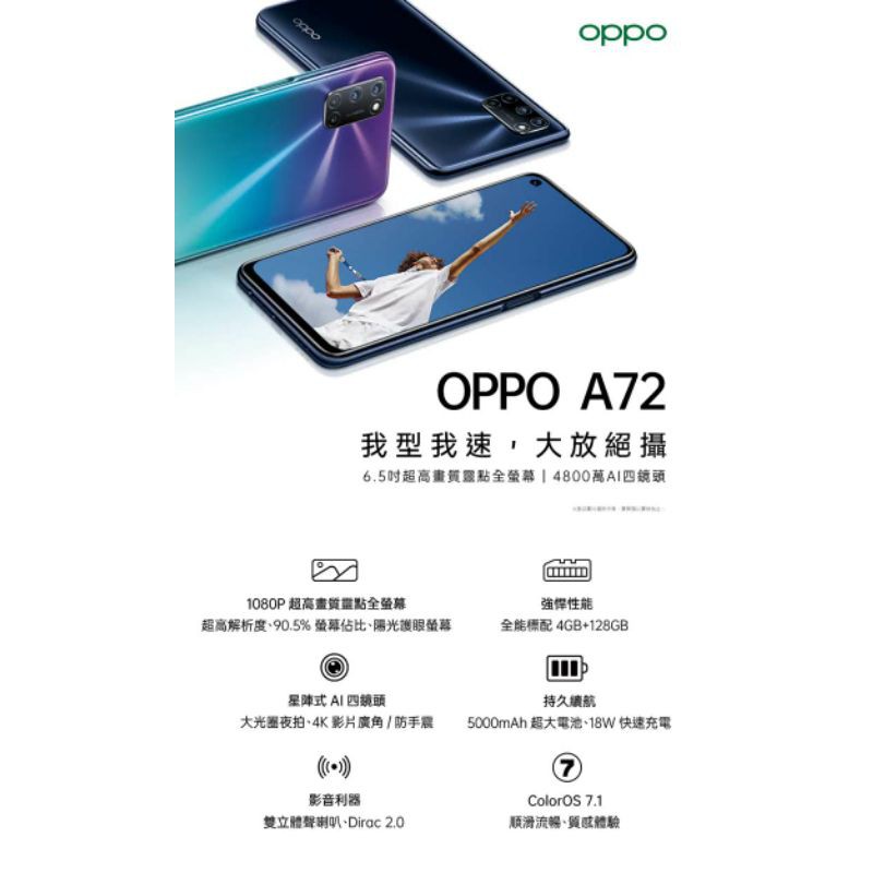 全新 中華電信保固一年 oppo A72 4+128G 四鏡頭 黑色幽默 空機