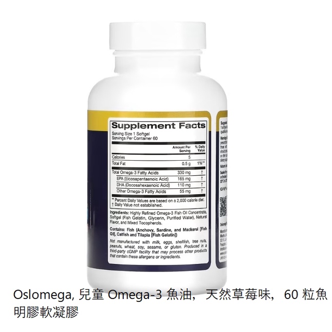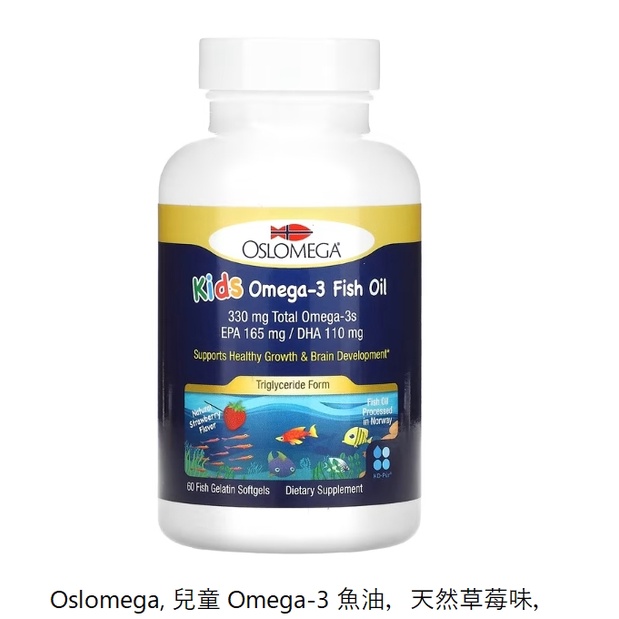 Oslomega兒童 Omega-3 魚油天然草莓味,60 粒魚油膠囊,配方含挪威 KD-Pür® 魚油(關注省5元喔)