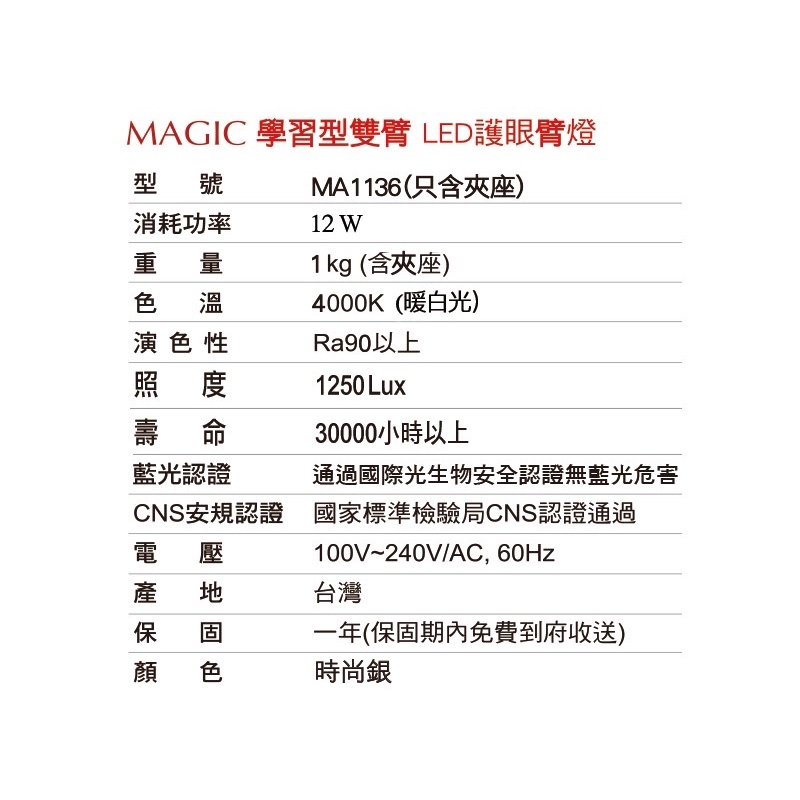 MAGIC 學習型雙臂LED護眼臂燈-MA1136