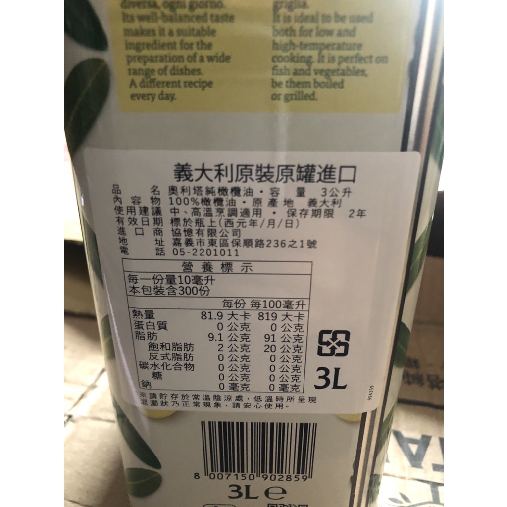 🌟雷特小舖🌟義大利 奧利塔《純橄欖油》3公升 (超商及蝦皮取貨限重1桶,超過請選宅配通)