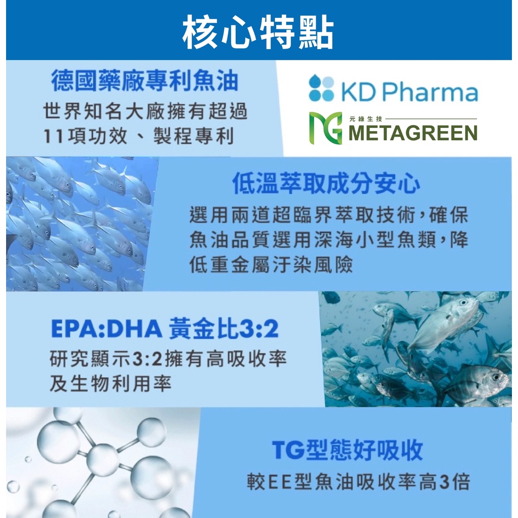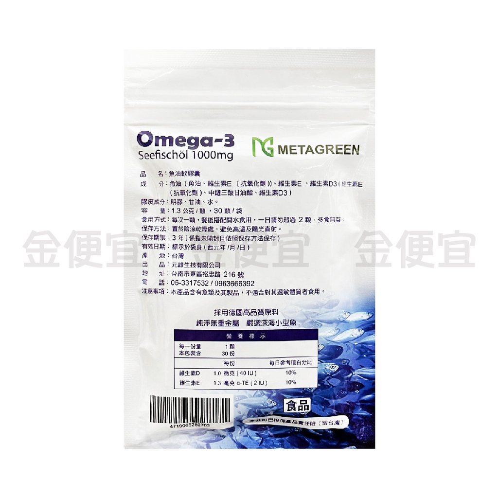 元綠生技 METAGREEN 頂級魚油軟膠囊 袋裝30顆 O-mega3 純淨好吞