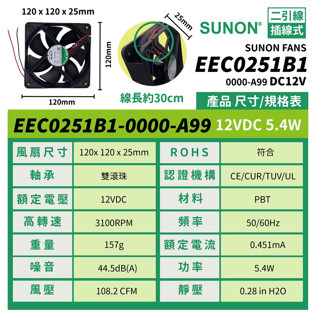 SUNON│建準 ★DC散熱風扇120mm★ EEC0251B1-0000-A99 /插線式/原廠授權經銷