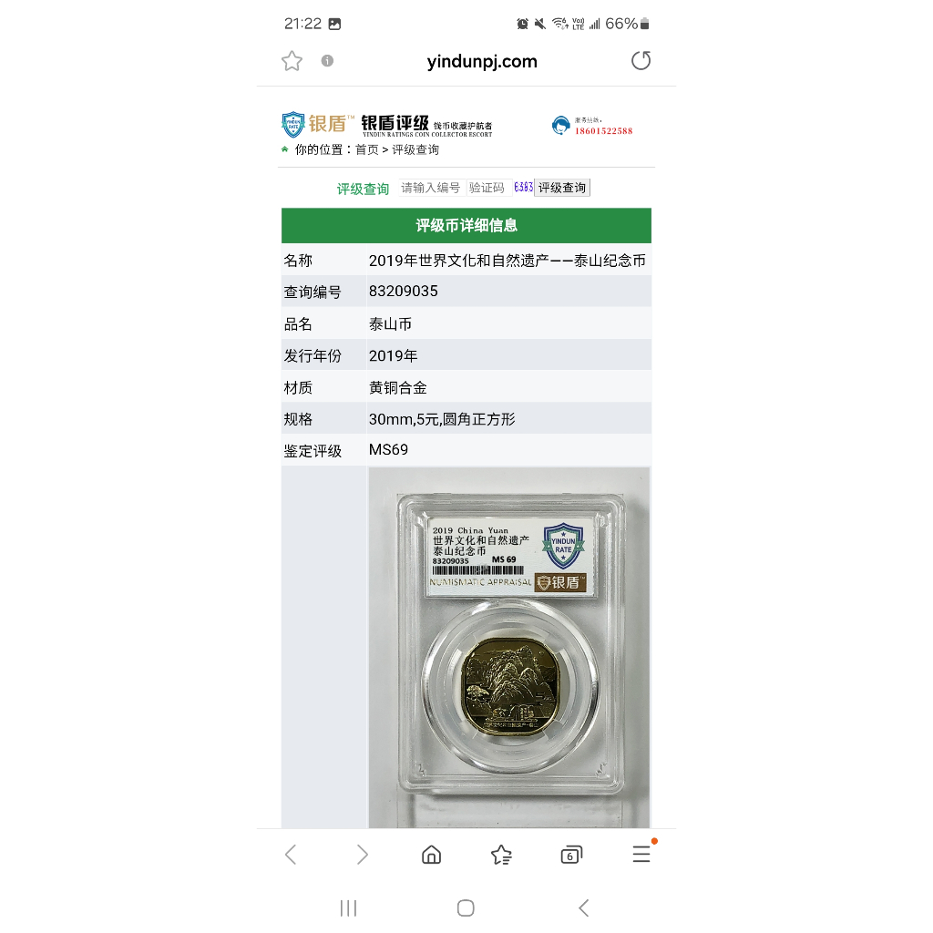 古幣 銀盾評級-MS69 世界文化和自然遺產泰山紀念幣(2019年)