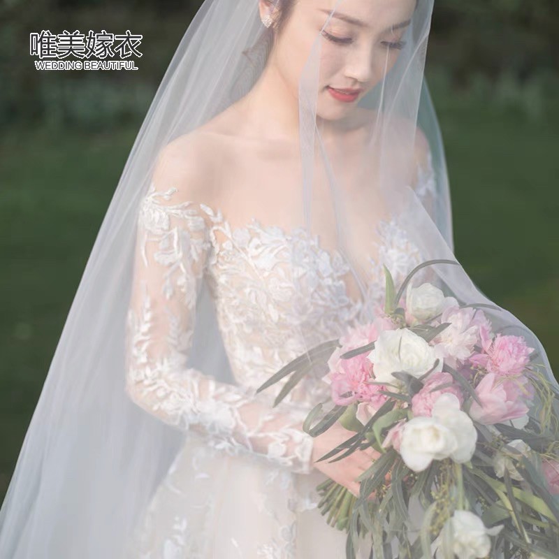 一字肩花朵星空小拖尾禮服