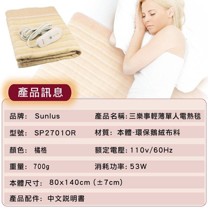 Sunlus三樂事 輕薄單人電熱毯SP2701