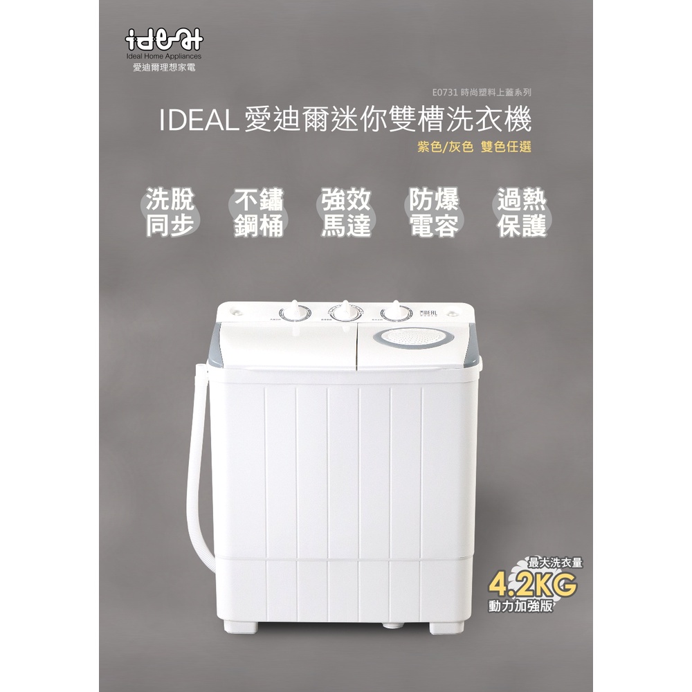 【IDEAL 愛迪爾】 雙槽 迷你洗衣機 ( E0731G Plus -4.2kg )-僅配送本島-迷你洗衣機