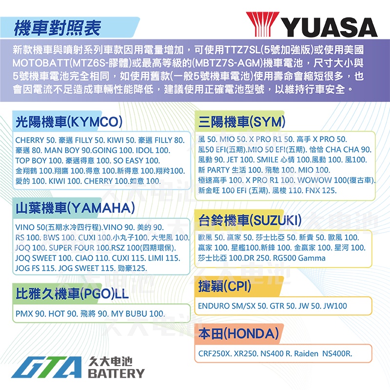 ✚久大電池❚ YUASA 機車電池 機車電瓶 TTZ7SL 適用 YTZ7S GTZ7S FTZ7S 重型機車電池