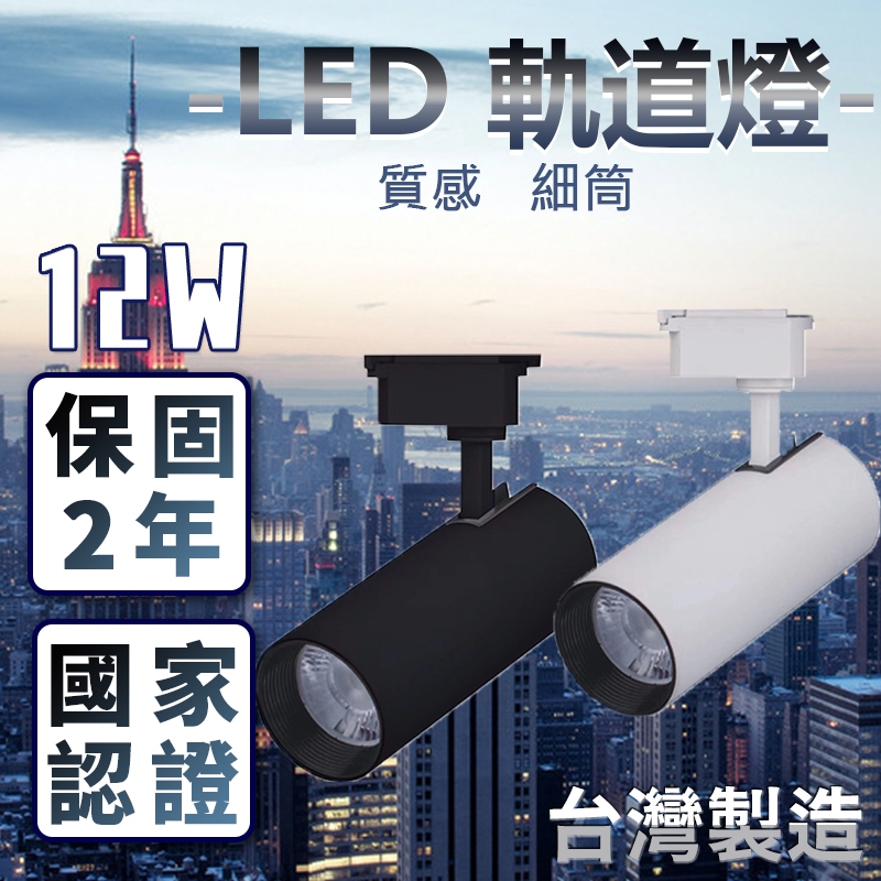 《台灣製造●質感細筒》Cob爆亮 LED軌道燈 黑/白經典消光直筒 12W 國家CNS認證 LED投射燈 原廠保固兩年