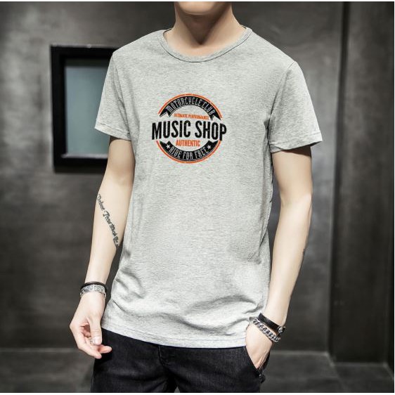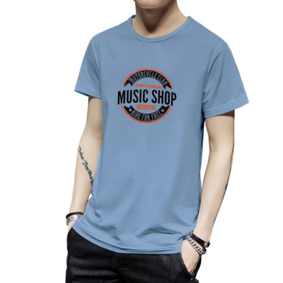 全新現貨韓款男生短袖上衣韓版時尚圓領短T休閒T恤音樂造型圖案寬鬆版舒適彈性短袖夏季T恤型男潮男短袖T恤-淺灰色/霧藍色