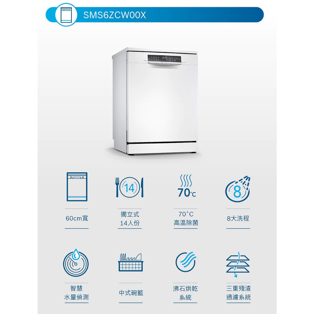 =快速安裝專區= BOSCH博世 SMS6ZCW00X 14人份 60公分寬 獨立式沸石洗碗機