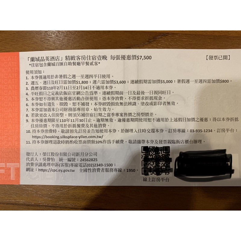 宜蘭 蘭城晶英 精緻客房 住宿券 含早餐二客 到110/11/30