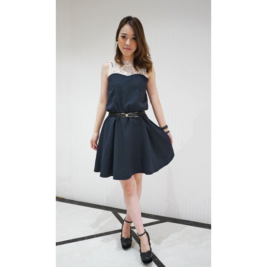 日本高單價品牌MIIA經典雕花蕾絲領縮腰洋裝(深藍色) Yabbi