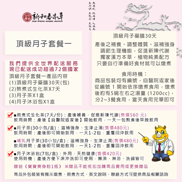 【頂級月子藥膳套餐一】頂級藥膳30天+月子茶1盒+熬煮式生化茶7天+沐浴包1盒