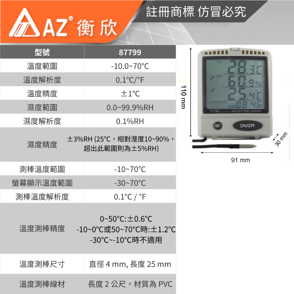 AZ 衡欣實業87799溫溼度SD卡記錄器(疫苗/生物/醫學/實驗室/警報提醒 溫度/溼度監控)